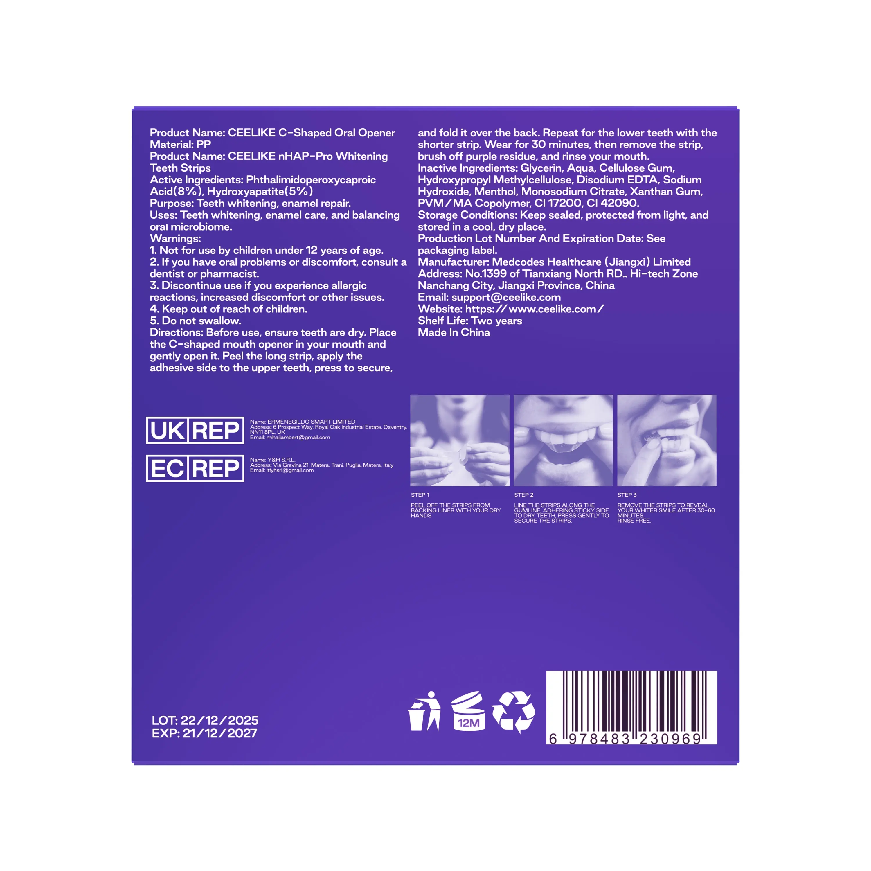 CEELIKE Purple Teeth Whitening Strips With Free Cheek Retractor - 7/21 Whitening Sessions -Nano-Hydroxyapatite Safe for Enamel - Non Sensitive Teeth Whitening - Peroxide-Free