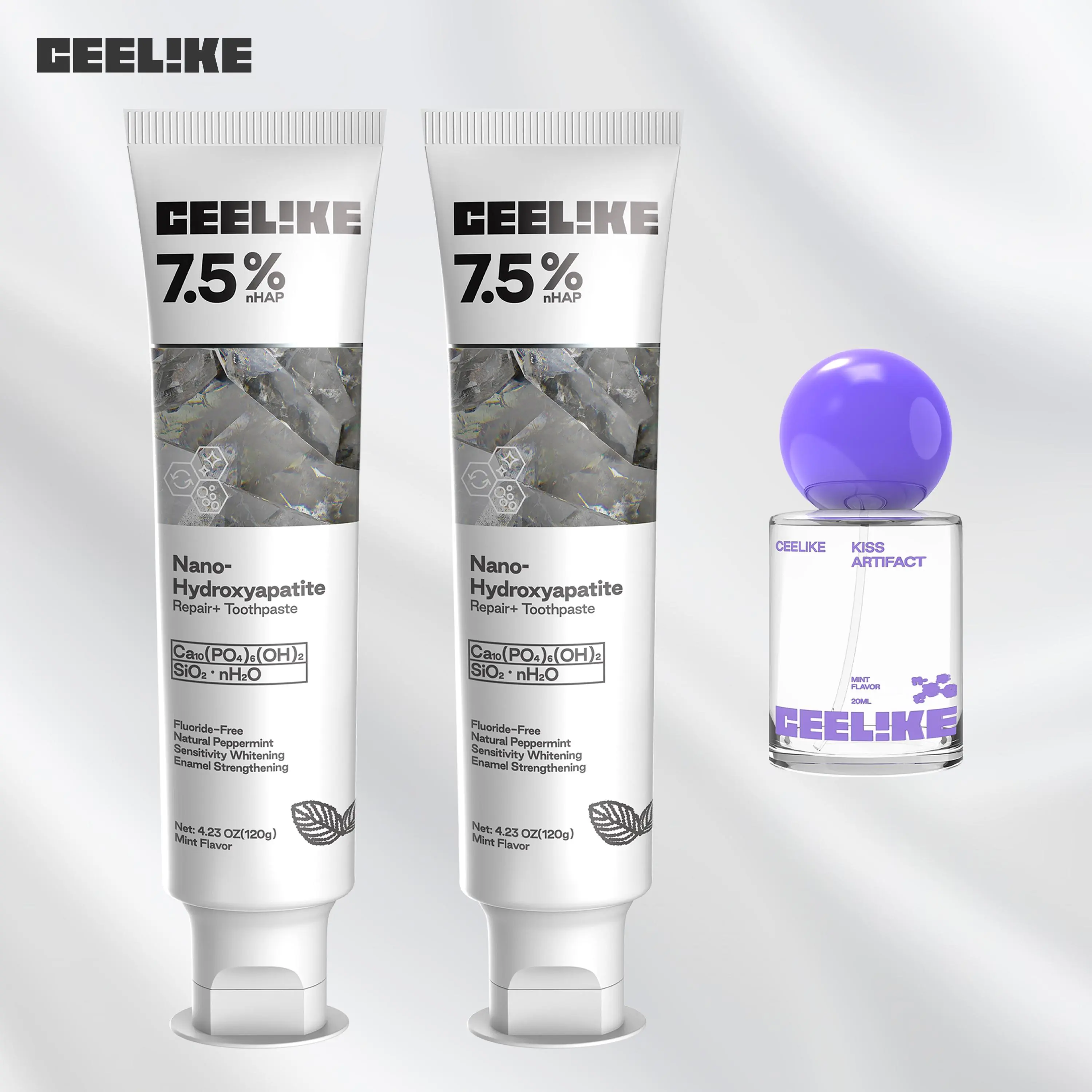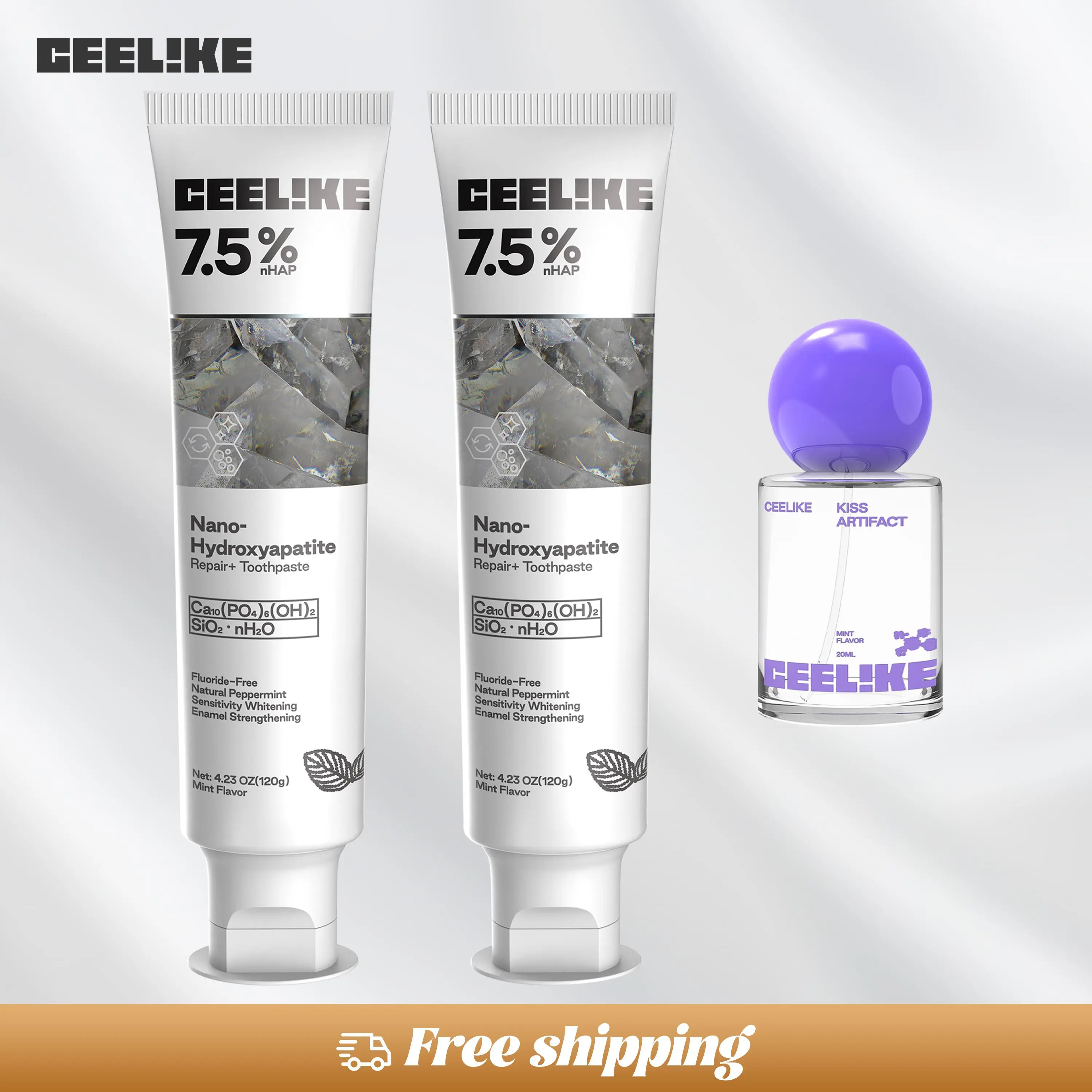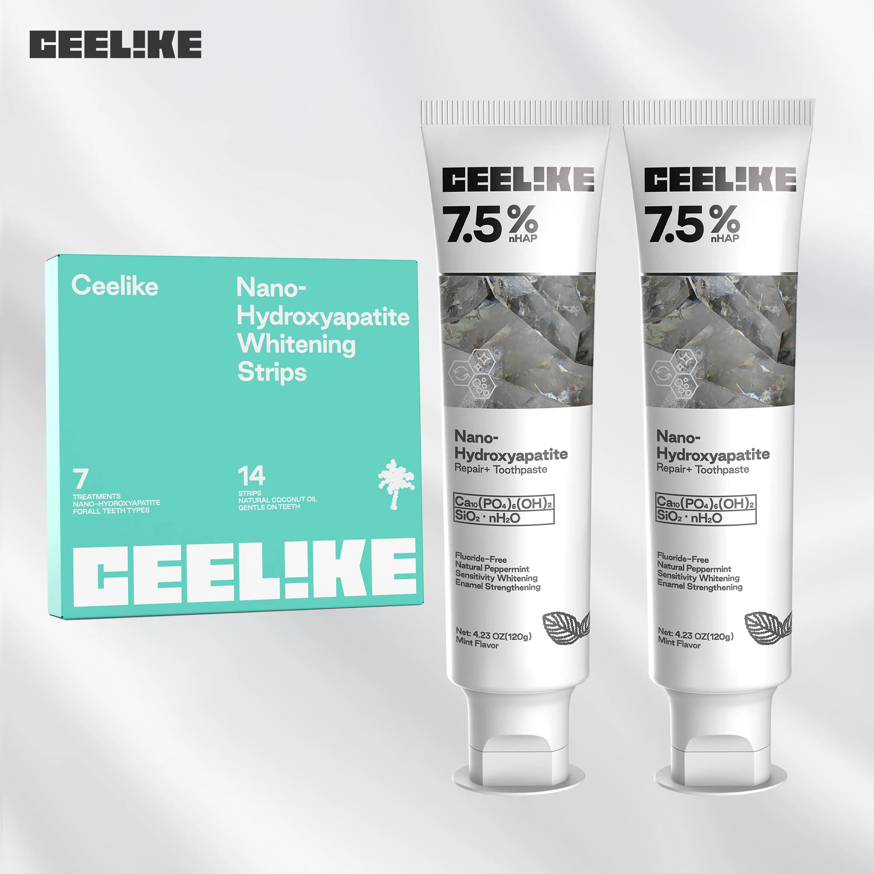 Ceelike offers a comprehensive oral care solution. The set includes an oral spray, hydroxyapatite toothpaste, and teeth strips. These products work together to provide fresh breath, strong teeth, and lasting protection. Perfect for maintaining oral hygiene.