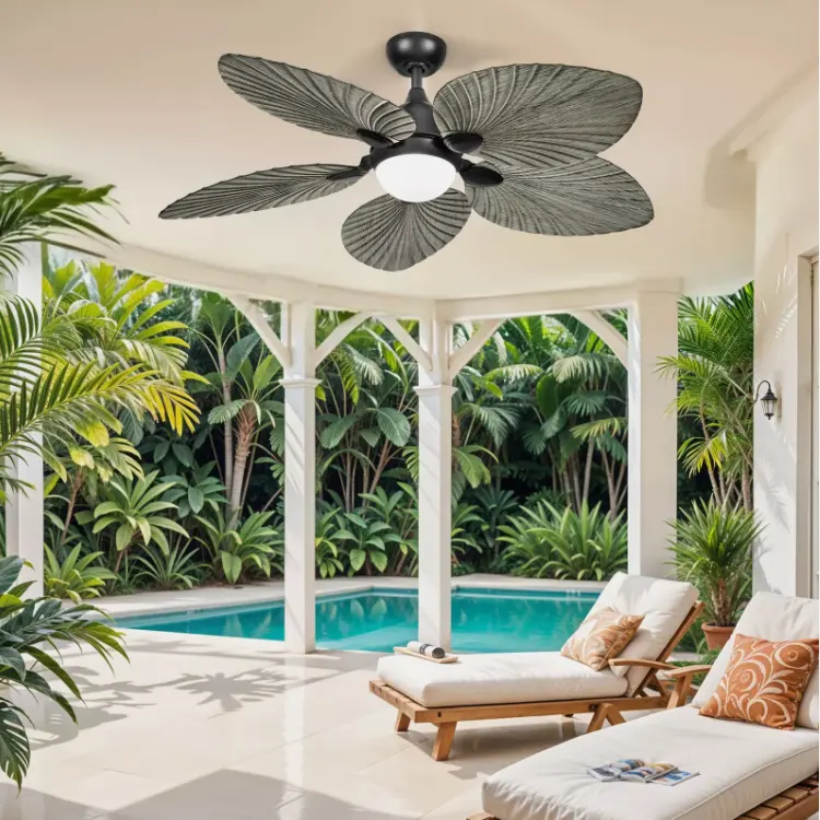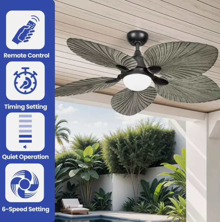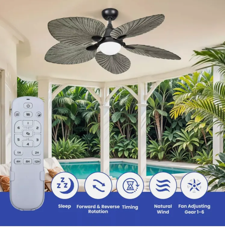 1. Tropical Elegance Grey Ceiling Fan with Palm Leaf Blades - Upgrade your interior with our tropical-inspired ceiling fan, featuring a stylish grey finish and five faux wood grain palm leaf blades under a glass lampshade. Compliant with ETL and FCC standards, this fan ensures top safety and quality while adding a tropical flair to your decor.