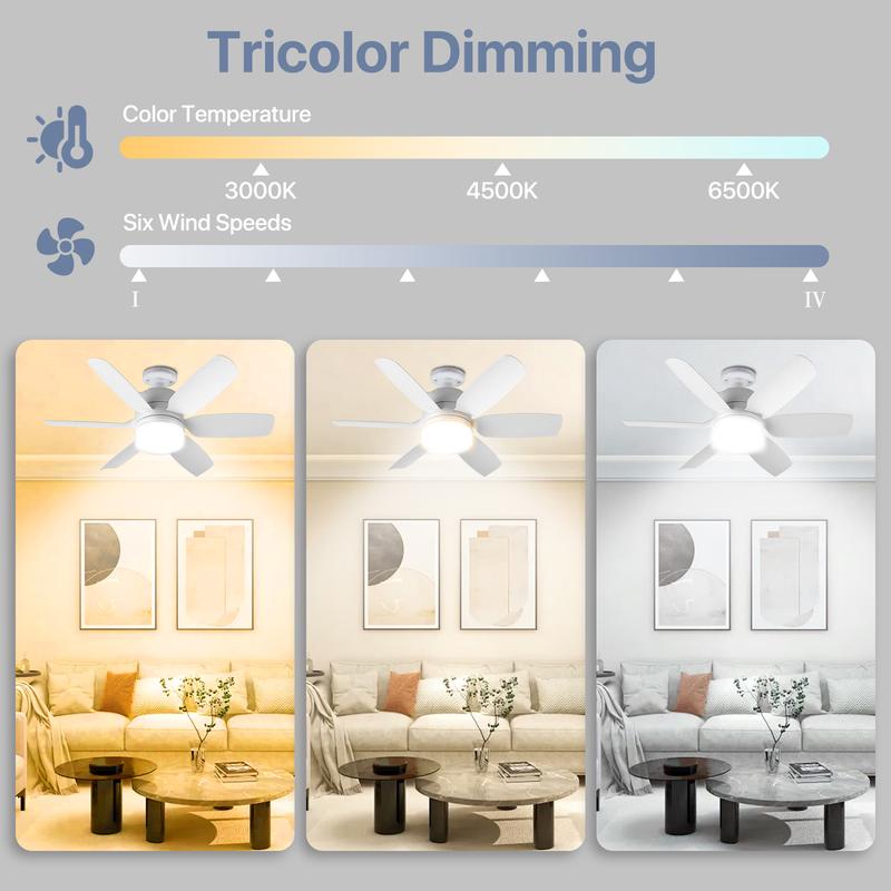 The fan provides 1200LM of light with three color options (white, warm white, yellow) and a color temperature range of 3000-6500K. Six blades and adjustable wind speeds offer a natural breeze, reaching up to 3 m/s at 1 meter while keeping noise levels low for peaceful sleep.