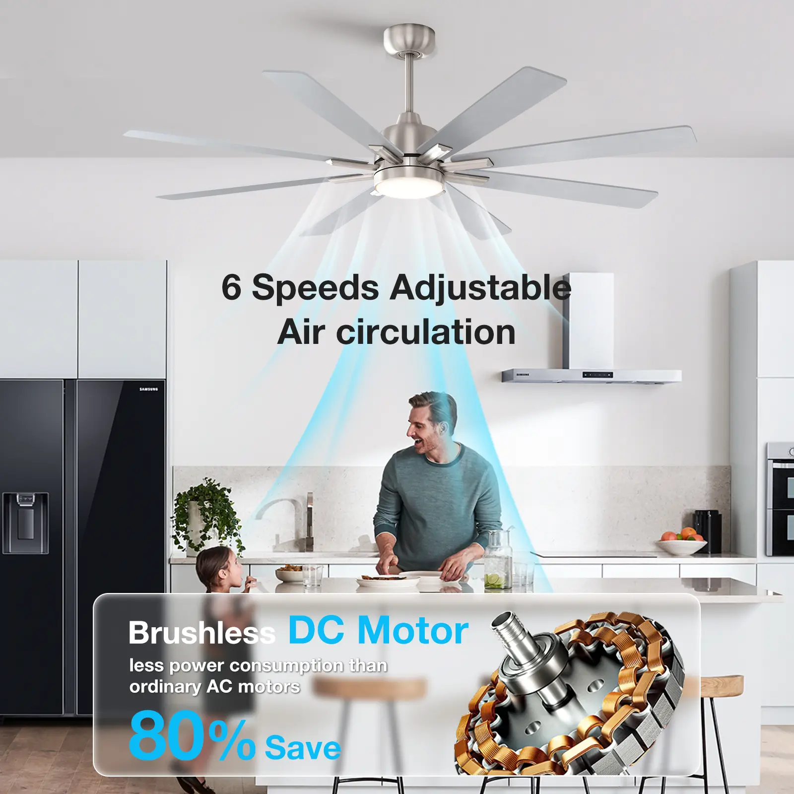 2. The ceiling fan utilizes an energy-efficient, high-performance DC motor, 5928CFM ,operating at a noise level below 35 decibels for quiet and comfortable use.Enjoy enhanced airflow for summer cooling and winter warmth while saving energy and reducing electricity costs.