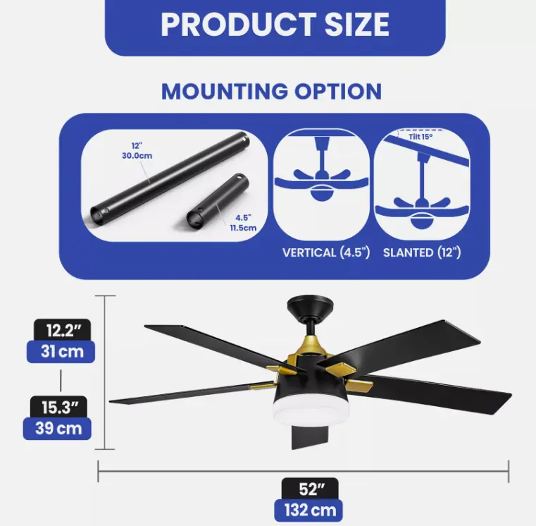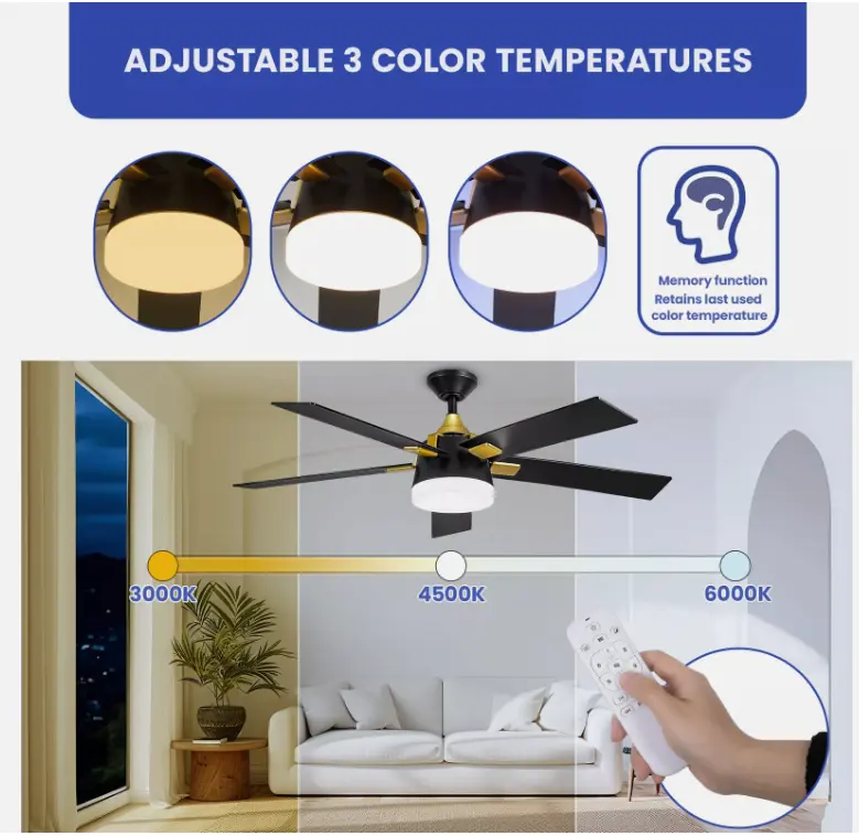 1. Luxurious 52-Inch Gold and Black Ceiling Fan - Enhance your decor with this elegant 52-inch ceiling fan, perfect for any living room, bedroom, or commercial space. Featuring a chic gold and black design, this fan combines sophisticated style with modern functionality.