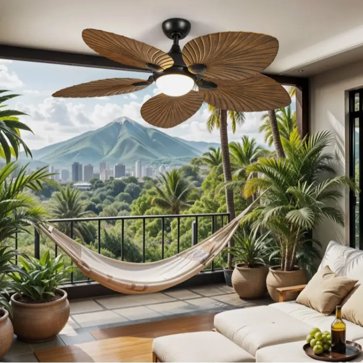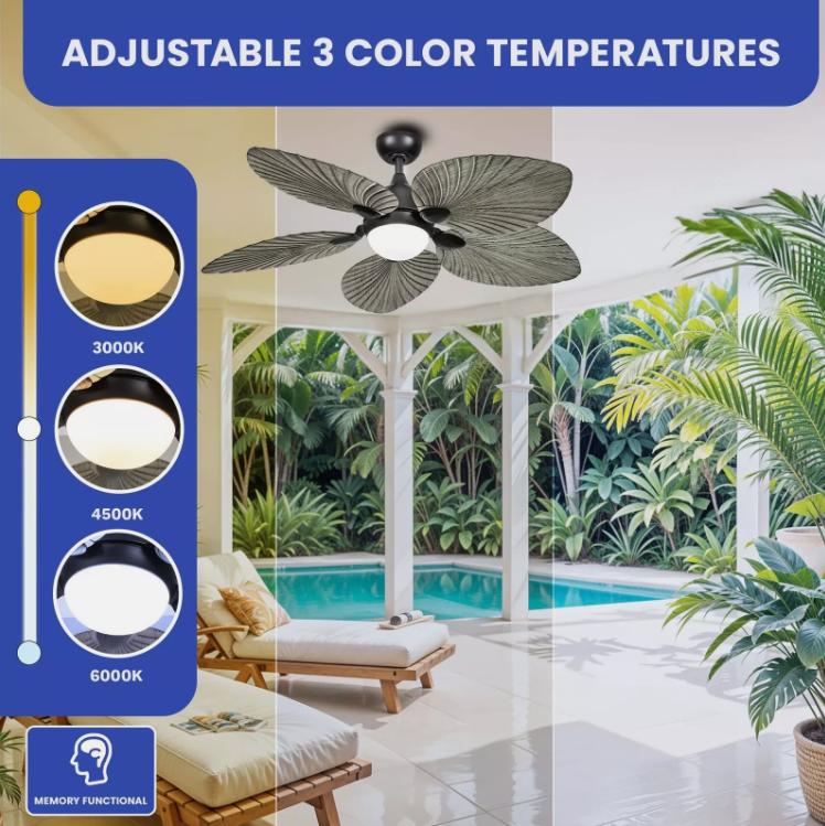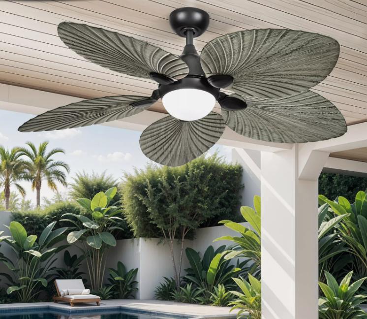 1. Tropical Elegance Grey Ceiling Fan with Palm Leaf Blades - Upgrade your interior with our tropical-inspired ceiling fan, featuring a stylish grey finish and five faux wood grain palm leaf blades under a glass lampshade. Compliant with ETL and FCC standards, this fan ensures top safety and quality while adding a tropical flair to your decor.