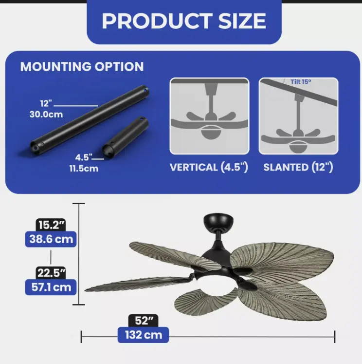 4. Ceiling Fan with Advanced Remote Control - Gain full control over your environment with the included multi-functional remote, featuring five timer settings (1, 2, 4, 8, and 12 hours) for automatic shutoff and a sleep mode that adjusts air speeds for optimal sleeping conditions. Simplify your life with this smart, user-friendly ceiling fan.