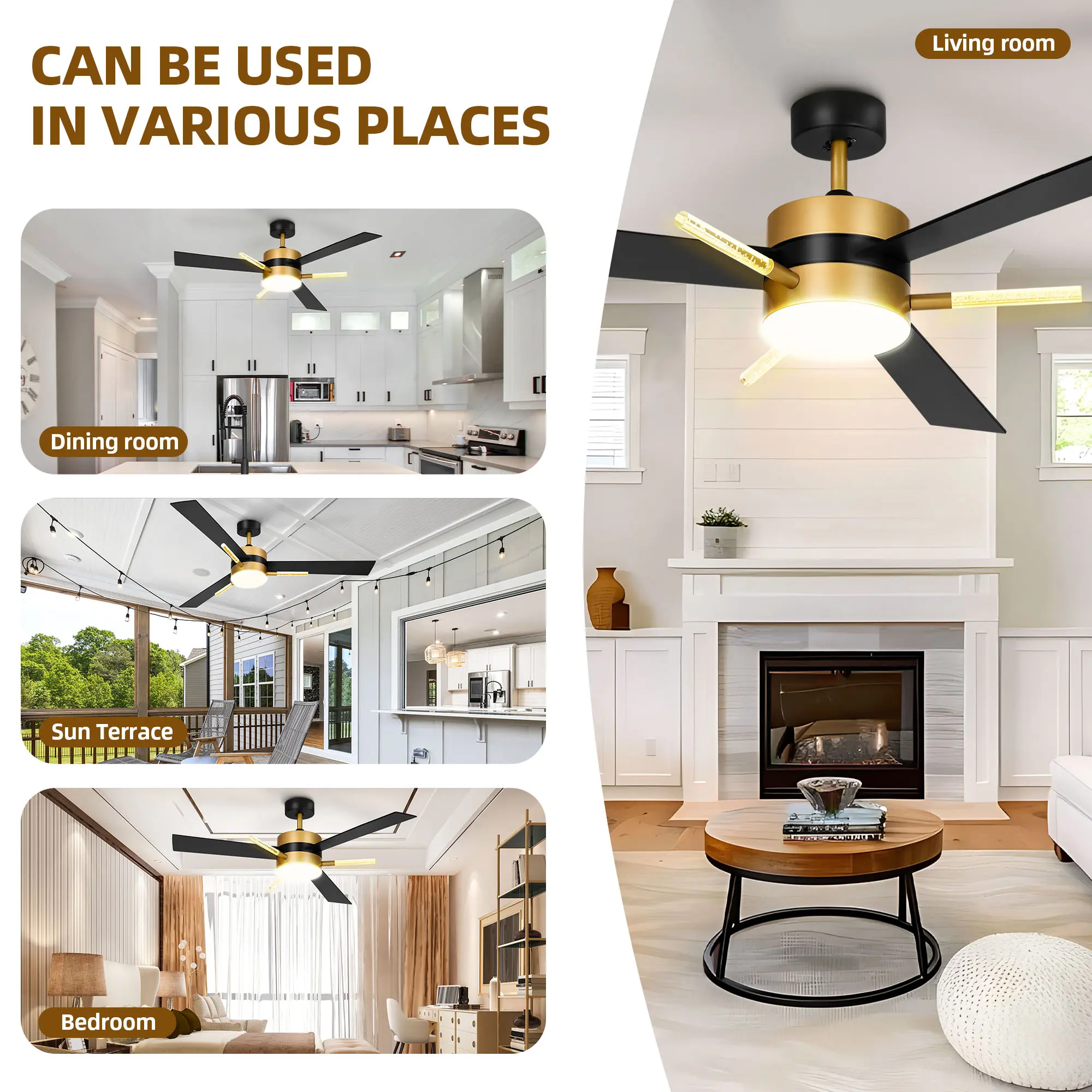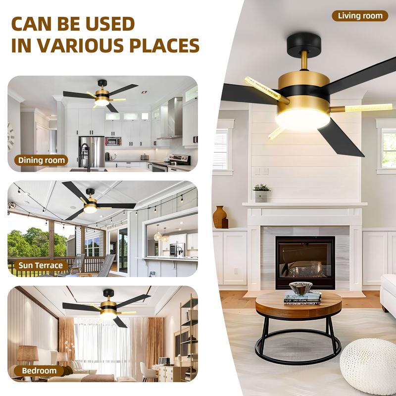 Adjustable LED Light Illuminate your space with our white gold ceiling fan's adjustable LED lights! Choose from warm glow (3000K), daylight (4500K), or cool white (6000K) to match your mood. Adjust brightness from 0% to 100% for ideal ambiance during work, leisure, or parties.