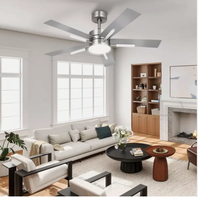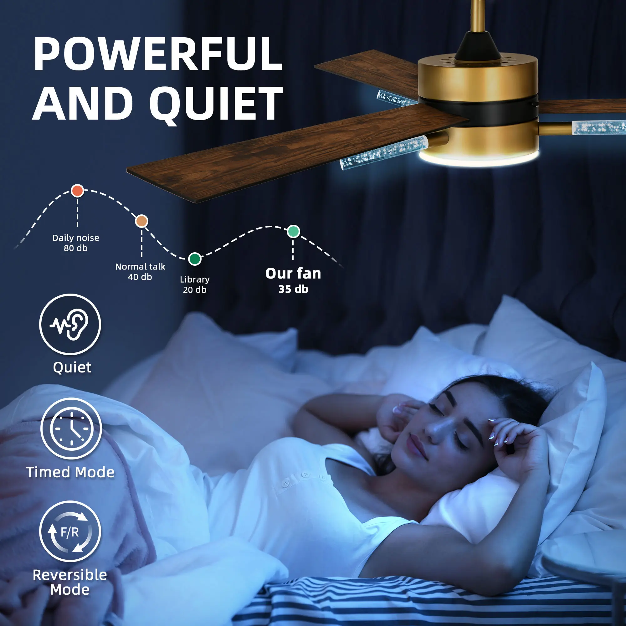 Ceiling Fan With Quiet Motor The silent DC motor of the outdoor ceiling fan boasts 6 speeds and operates under a whisper-quiet 35db, creating a peaceful environment. In daily use, the noise level is lower than 35 decibels, which is suitable for bedroom, hall, dining room, living room and so on. And includes a 1/4/8 timer function for convenience and energy efficiency