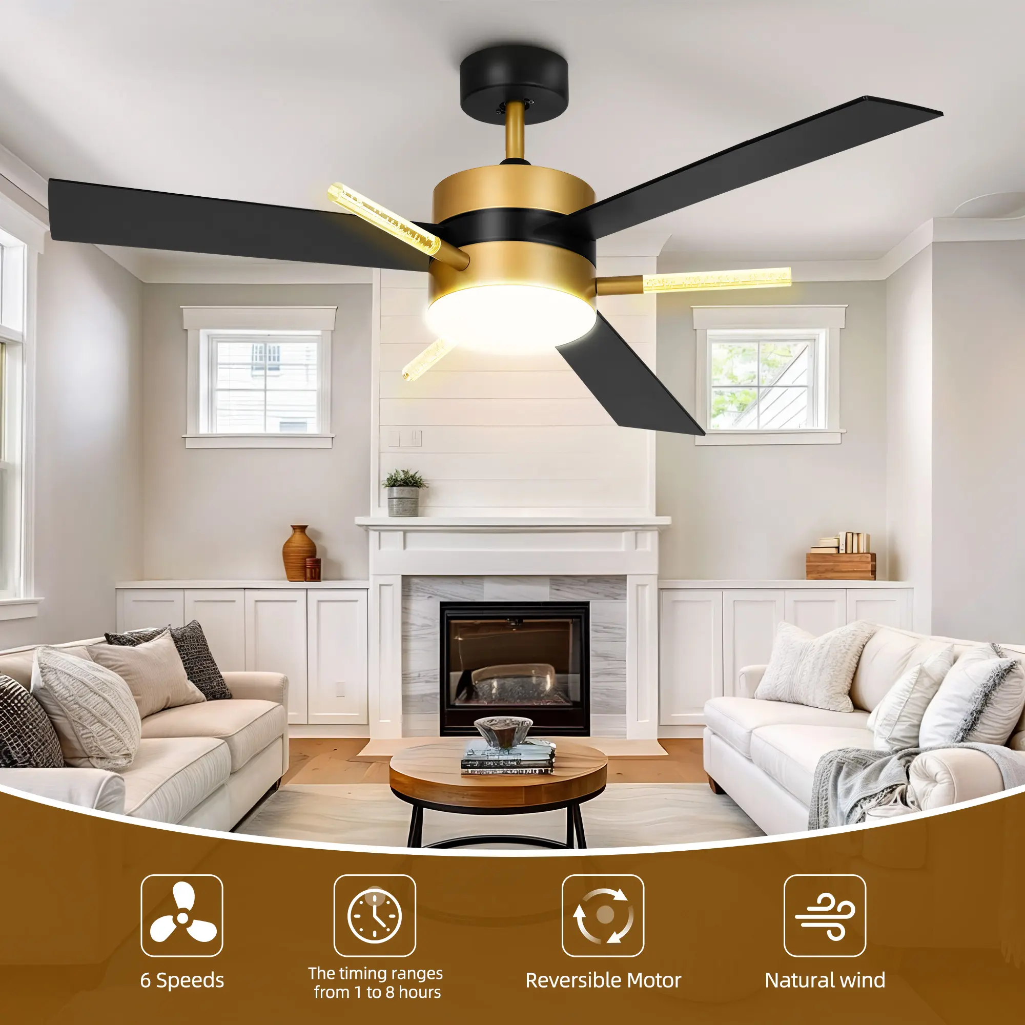 Reversible 6-Speed Adjustable Fan The ceiling fan takes control of your comfort with 6 adjustable fan speeds, providing the perfect breeze for any occasion. The reverse function improves the air circulation with two rotation in different seasons, which can cooling your summer and warm your winter. Additionally, black ceiling fan with quiet DC motor brings a comfortable living enviroment, provding a relaxing living experience and longer lifespan.