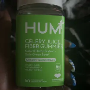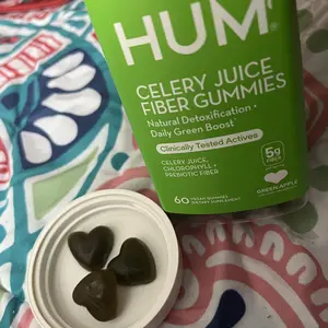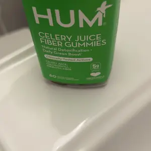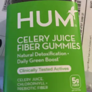 HUM: Celery, juice, fiber, gummy’s. I love them. They are so delicious. They’re so good. You wanna eat the whole container and it does work. I will keep getting these. I do recommend them awesome ingredients. Please try taste like Apple Yum Yum.🙏🏽💝🥰😋