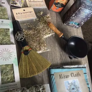 Everything arrived in great condition. The coffee cup with the tarot card is my favorite out of it all. It came with some crystals, a necklace, a bracelet, lots of incese sticks & cones, oils, ritual candles, sage stick, a small wooden wand, tarot deck, alter cloth, and a leather book to write.
