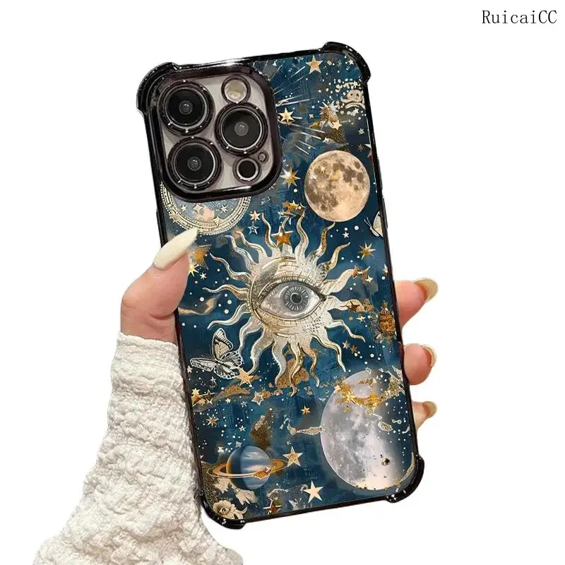 Celestial Sun and Moon themed Pattern Four Comers Air Cushion Anti-drop phone case Suitable for iPhone 16 15 14 13 12 11 Pro Max Plus electroplated Shockproof case Screen Protector Protection Protective Cover Smartphone Casing