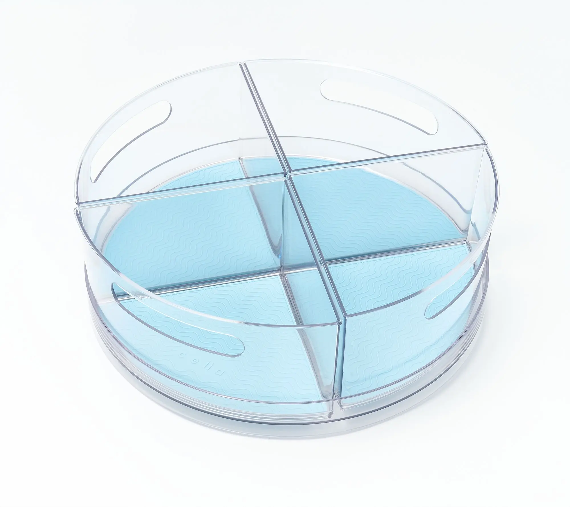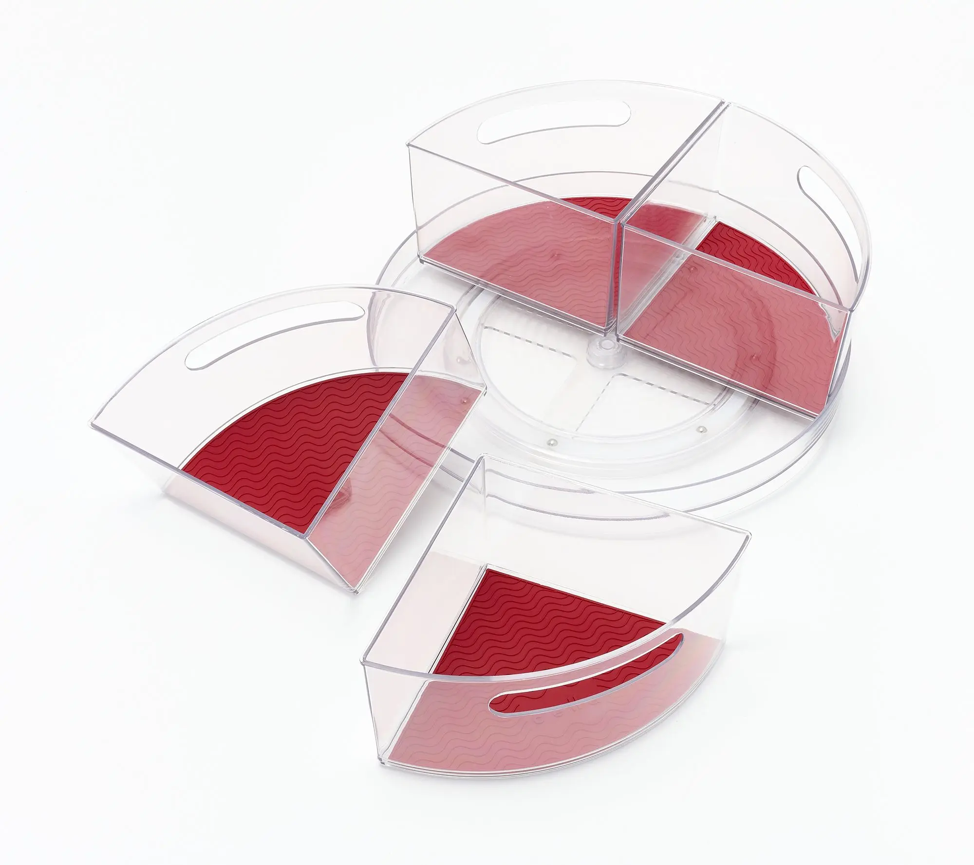 This Cella 11.5" Low Wall Clear Turntable with Removeable Dividers and Liner. Maximize cabinet space with this revolving storage solution. Measures Approximately: 11-1/2" Diameter x 4" High. Hand wash. Liner can be washed in dishwasher. Plastic/Silicone. Fridge / Freezer Safe. BPA Free. Choice of colors: White Linen, Graphite, Redwood, Sky Blue, Green Tea. Imported.