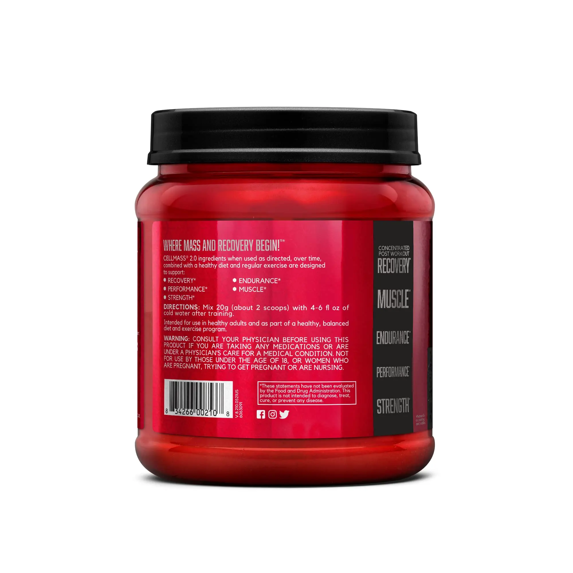 Athletes who are adequately recovered from an intense training session are better prepared to excel in the following day's workout. Post workout, muscles are in a state of heightened stress and are working to recover and rebuild, helping to pave the way for muscle protein synthesis, strength and athletic performance. CELLMASS 2.0 is a versatile recovery product that can be stacked with your post-workout protein shakes or mixed directly into cold water. The refreshing fruit flavors are designed to complement BSN chocolate or vanilla protein powders and also taste great as a standalone supplement.