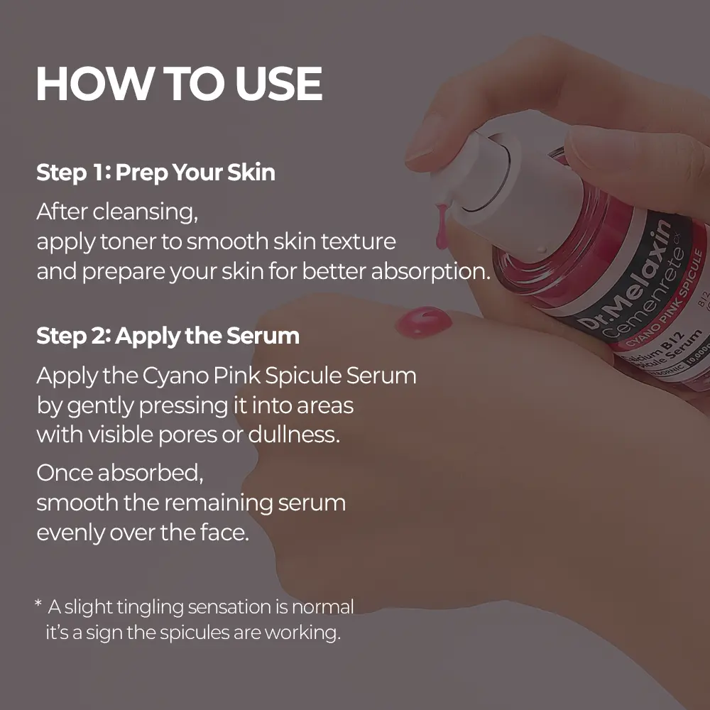 Apply the Cyano Pink Spicule Serum gently to areas with visible pores or dullness. Once absorbed, smooth the remaining serum evenly over the face. Follow with toner for optimal results. Enjoy refined pores, restored glow, and a noticeable difference in just one pink step.