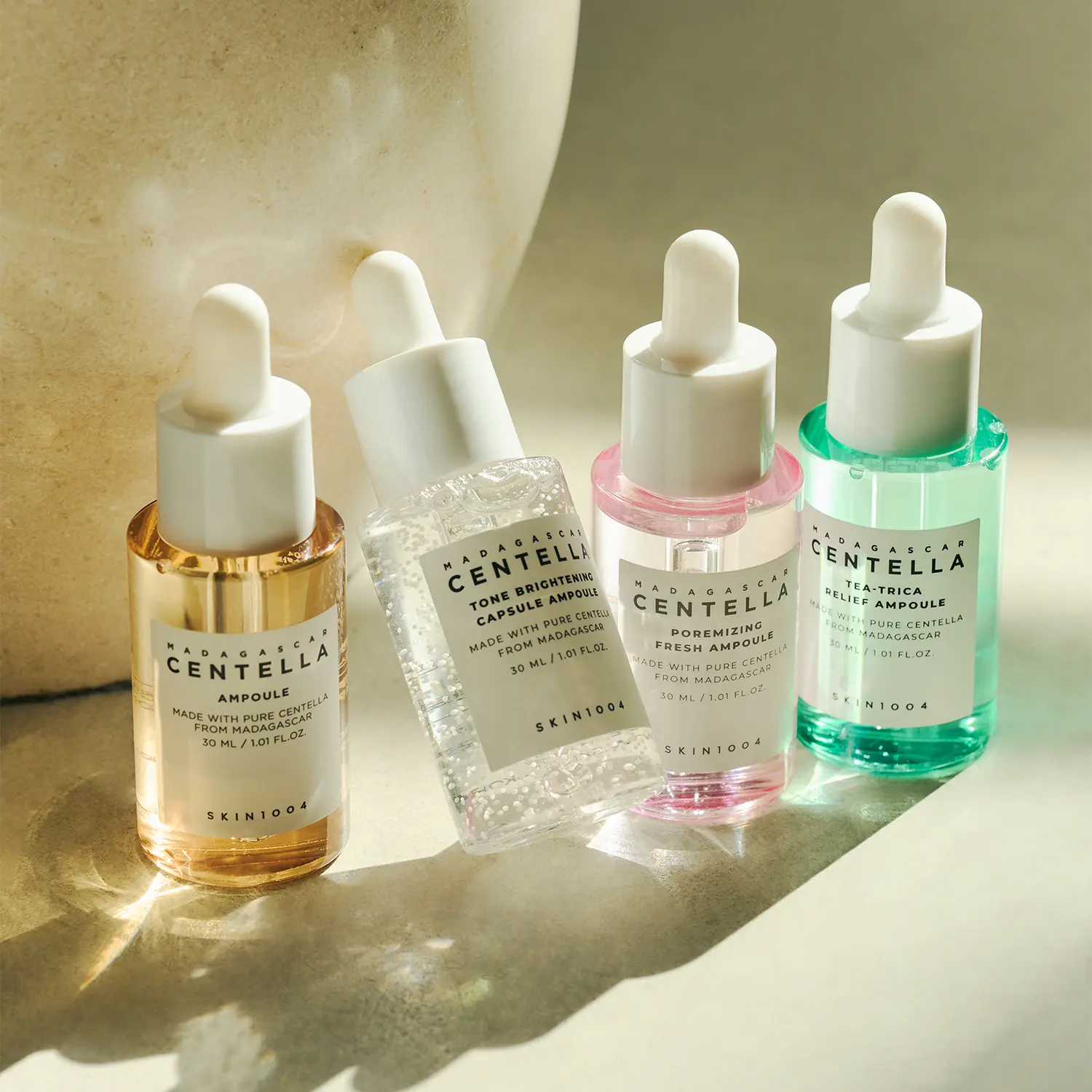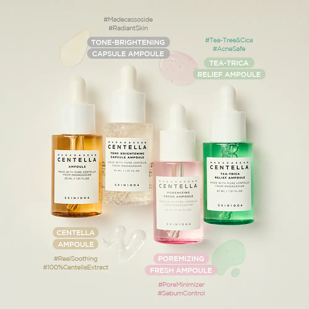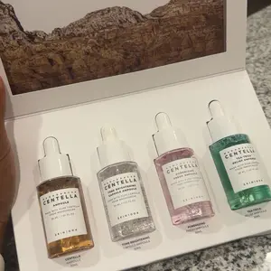 SKIN1004's limited edition Centella Ampoule Kit includes all top-selling ampoules. This 4 mini-sized kit offers soothing, dark spot correction, acne care, and pore tightening. Each ampoule is 30ml, perfect for multi-functional skincare needs.