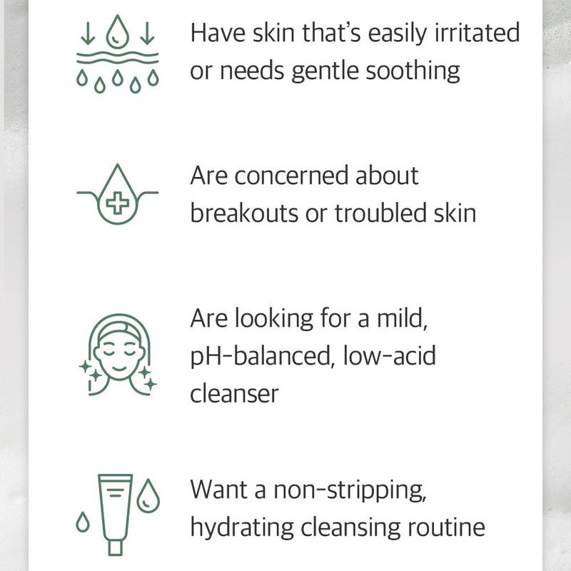 IngredientsWATER (AQUA),SODIUM COCOYL ISETHIONATE,GLYCERIN,HYDROXYPROPYL STARCH PHOSPHATE,SODIUM METHYL COCOYL TAURATE,PROPANEDIOL,POTASSIUM COCOYL GLYCINATE,ACRYLATES COPOLYMER,CETEARYL ALCOHOL,POTASSIUM COCOATE,SORBITAN OLIVATE,SALICYLIC ACID,GLYCOL DISTEARATE,GLYCERYL STEARATE,CITRIC ACID,CAPRYLYL GLYCOL,BUTYLENE GLYCOL,1,2-HEXANEDIOL,GLYCERYL CAPRYLATE,CENTELLA ASIATICA EXTRACT,DISODIUM EDTA