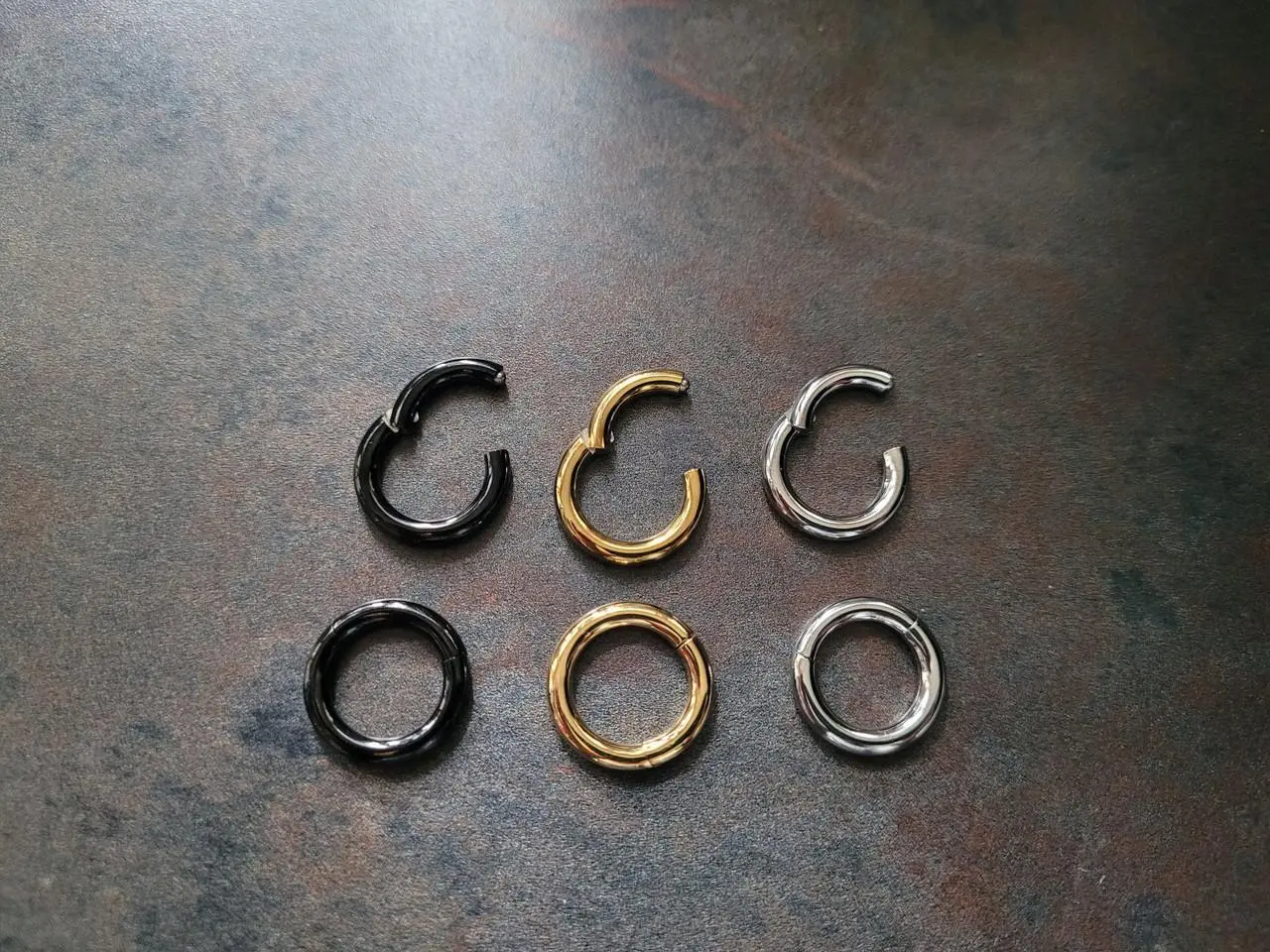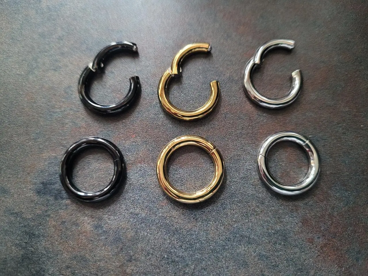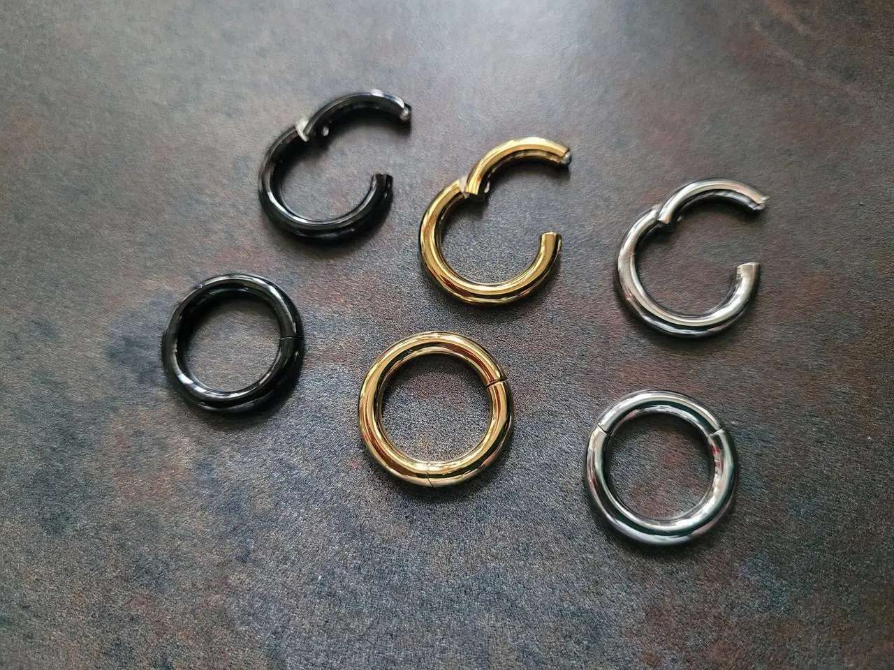 Made from high-quality 316L surgical steel, these rings come in plain steel, black anodized, or gold anodized finishes. Perfect for septum, nose, eyebrow, ear (lobe, tragus, conch, helix, daith), or any stretched piercing.