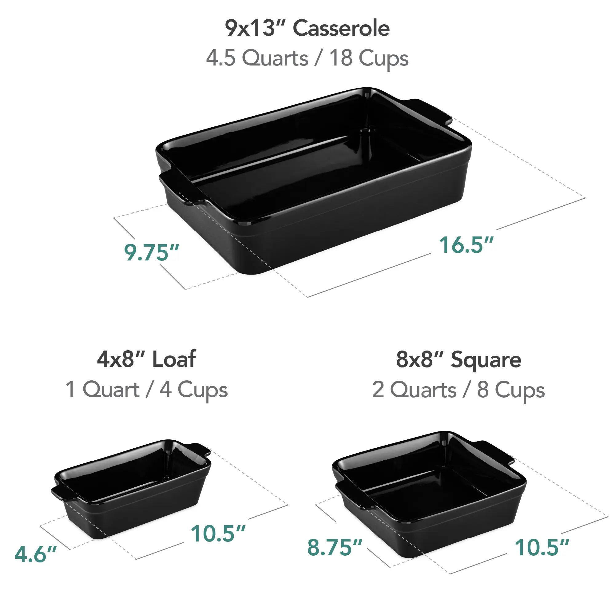 Includes: Casserole Dish, Square Pan, Loaf Pan