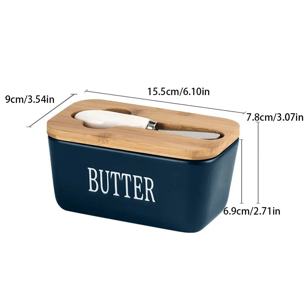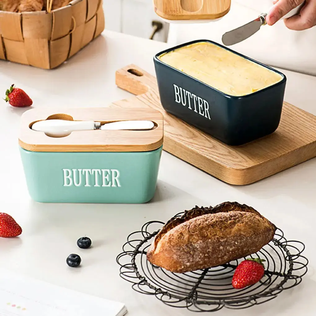 Ceramic Butter Dish with Knife, Rectangular Cheese Container with Wooden Lid, Ceramic Butter Box for Kitchen Use