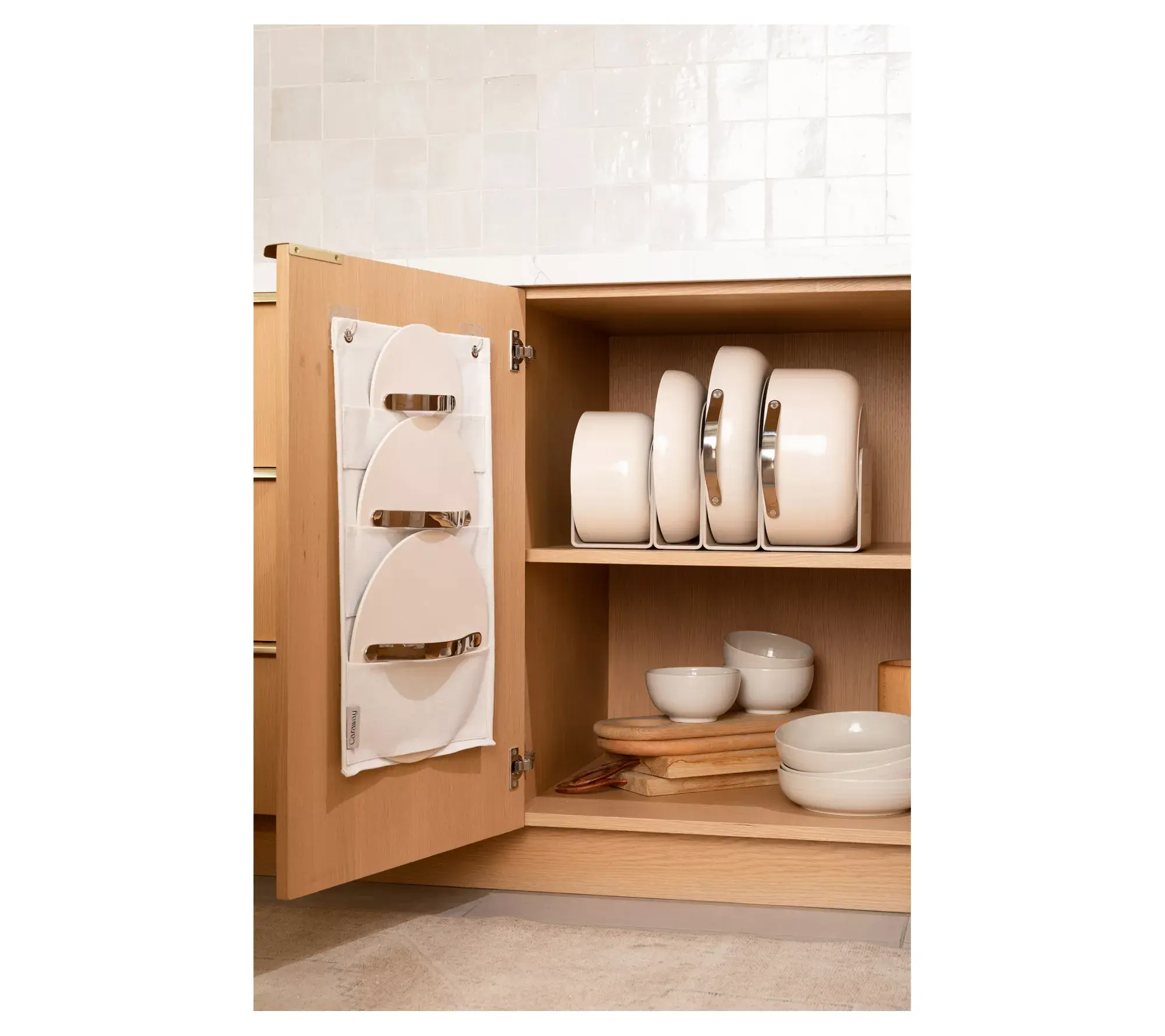 Includes 10.5" fry pan, 3-qt saucepan with lid, 4.5-qt saute pan with lid, 6.5-qt Dutch oven, pan storage, and lid storage