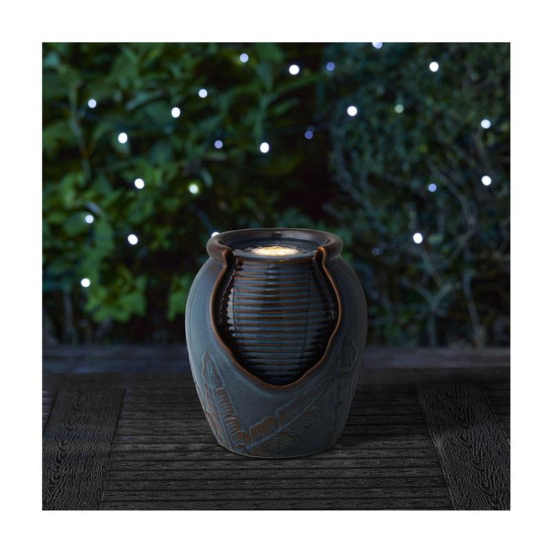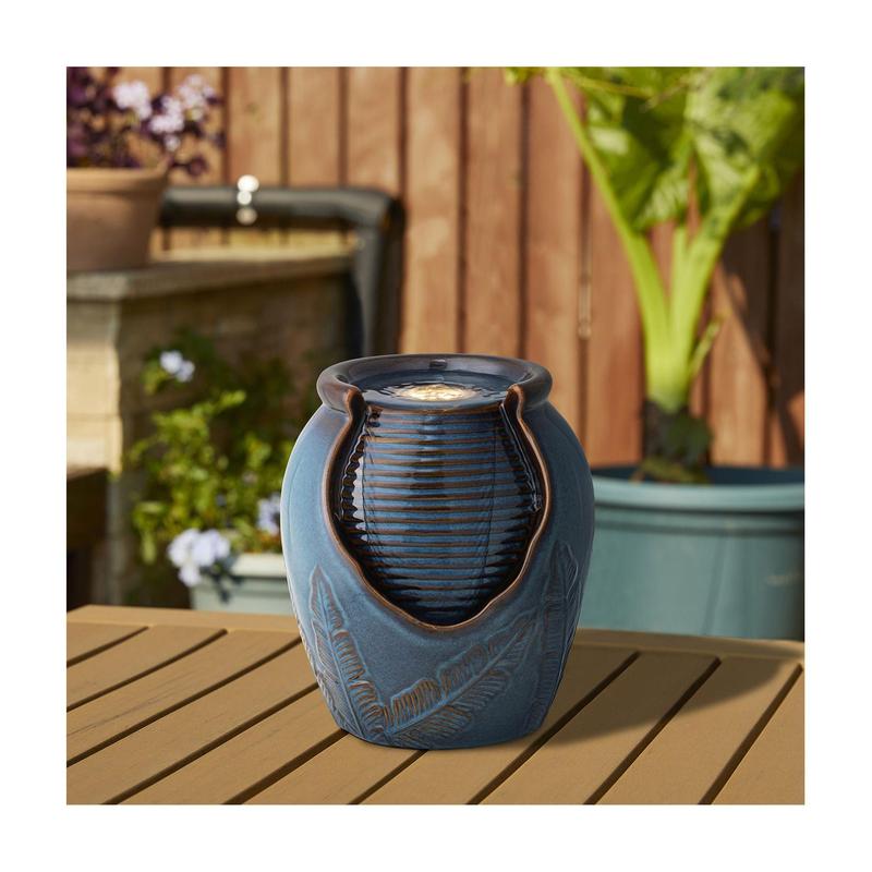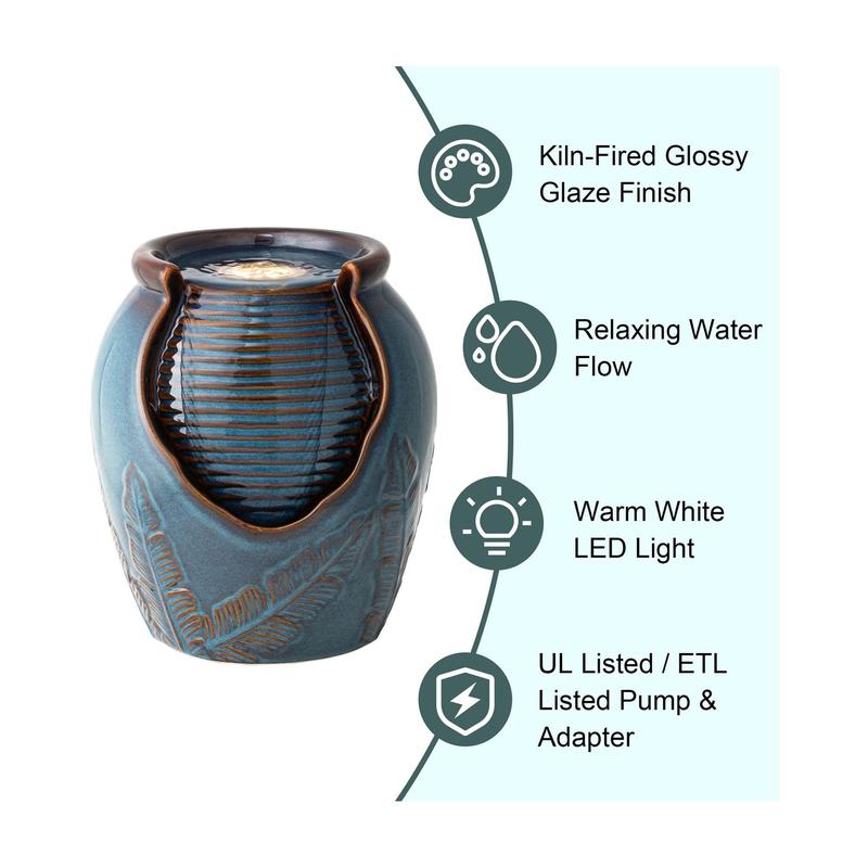 Embrace the soothing sound of cascading water, as this beautifully crafted ceramic tabletop fountain transforms your space into a tranquil retreat. With an elegant embossed leaves texture and an antiqued kiln-fired glaze finish, every detail adds a touch of artistic charm. Enjoy the warm white LED light as it ripples and sparkles through the water, creating a calming, meditative ambiance, perfect for any garden, porch, or indoor area. From Glitzhome.