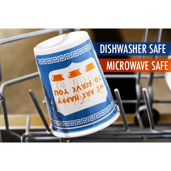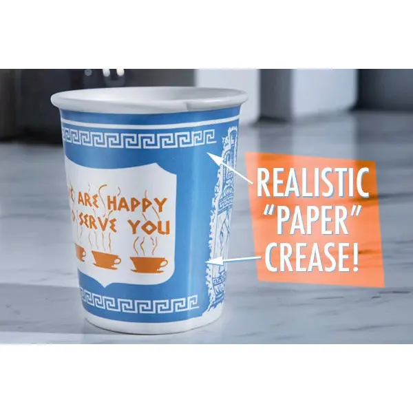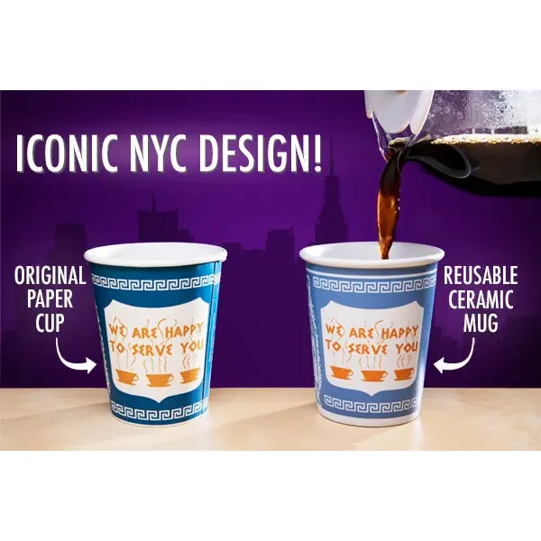 Attention current New Yorkers, ex-New Yorkers, and those of you who long to be New Yorkers: Now you can enjoy a classic symbol of the Big Apple in an environmentally-friendly way with the Ceramic Greek Coffee Cup. This reusable version of the iconic "We Are Happy To Serve You" paper coffee cup is styled precisely upon the original disposable version found throughout New York. Exclusively licensed from the company that manufactures the paper edition, the 10-ounce Ceramic Greek Coffee Cup's design is 100% accurate and even features a "paper crease" for added realism. Both dishwasher and microwave safe.