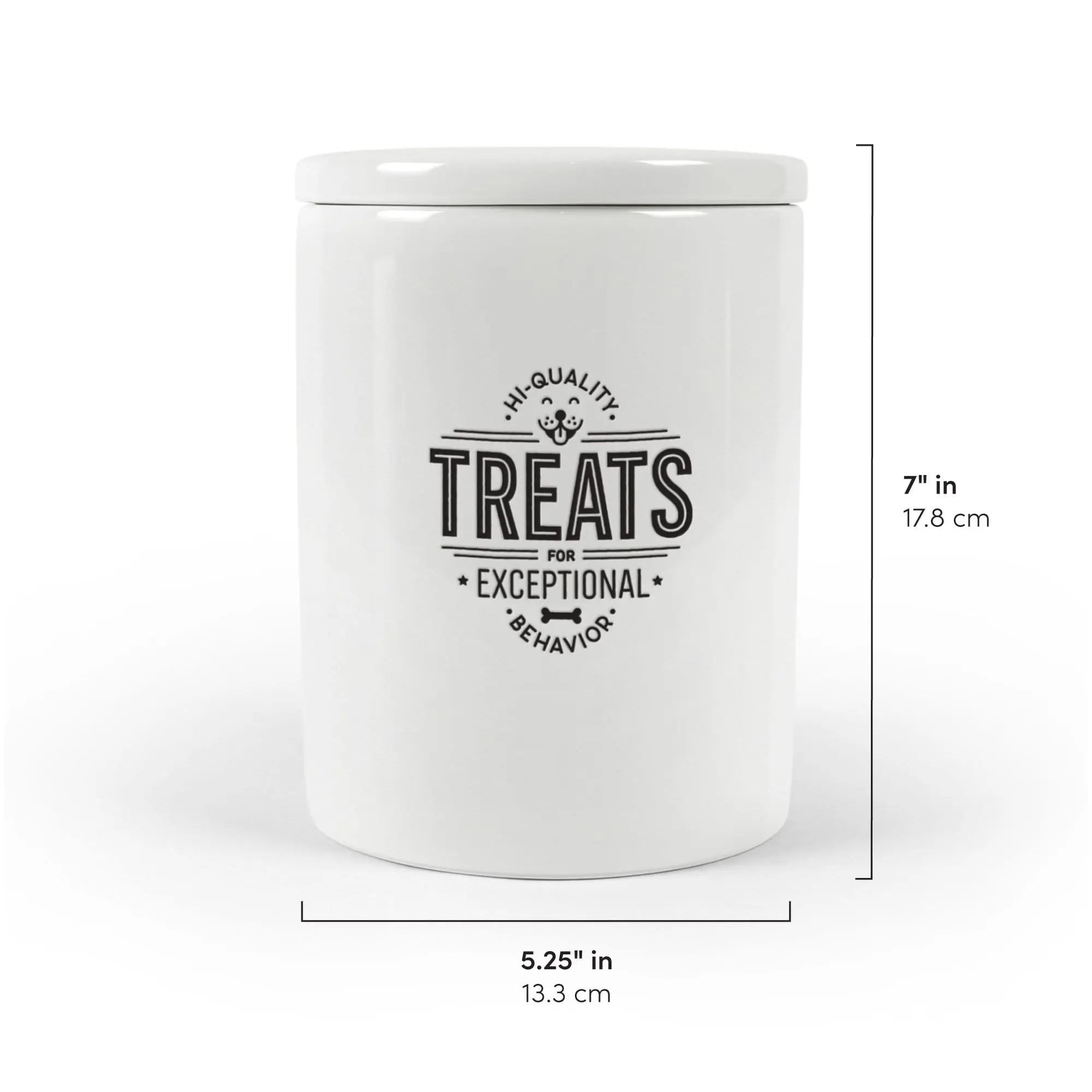 Howligans simple-yet-stylish ceramic treat jars are perfect for all pet lovers! The lid features a tight silicone gasket seal to keep your pet’s treats fresher, longer. This classy white stoneware jar measures 5.25" x 5.25" x 7" and is decorated with an attractive wax-resist design.