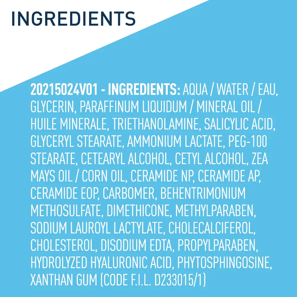 | Ingredients | AQUA / WATER / EAU,GLYCERIN,PARAFFINUM LIQUIDUM / MINERAL OIL / HUILE MINERALE,TRIETHANOLAMINE,SALICYLIC ACID,GLYCERYL STEARATE,AMMONIUM LACTATE,PEG-100 STEARATE,CETEARYL ALCOHOL,CETYL ALCOHOL,ZEA MAYS OIL / CORN OIL,CERAMIDE NP,CERAMIDE AP,CERAMIDE EOP,CARBOMER,BEHENTRIMONIUM METHOSULFATE,DIMETHICONE,METHYLPARABEN,SODIUM LAUROYL LACTYLATE,CHOLECALCIFEROL,CHOLESTEROL,DISODIUM EDTA,PROPYLPARABEN,HYDROLYZED HYALURONIC ACID,PHYTOSPHINGOSINE,XANTHAN GUM |