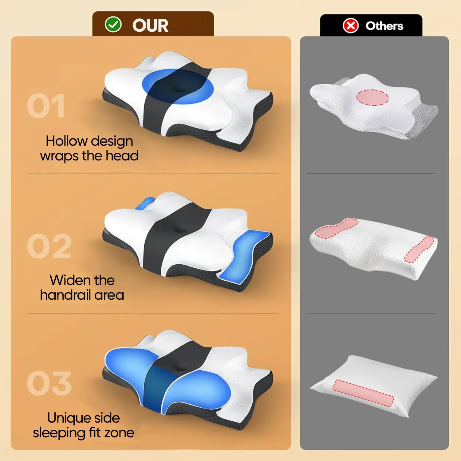 Sleep guru-recommended neck pillow, side sleeper pillow, contoured ergonomic memory foam pillow for back and stomach sleepers, two height options, zoned contour design