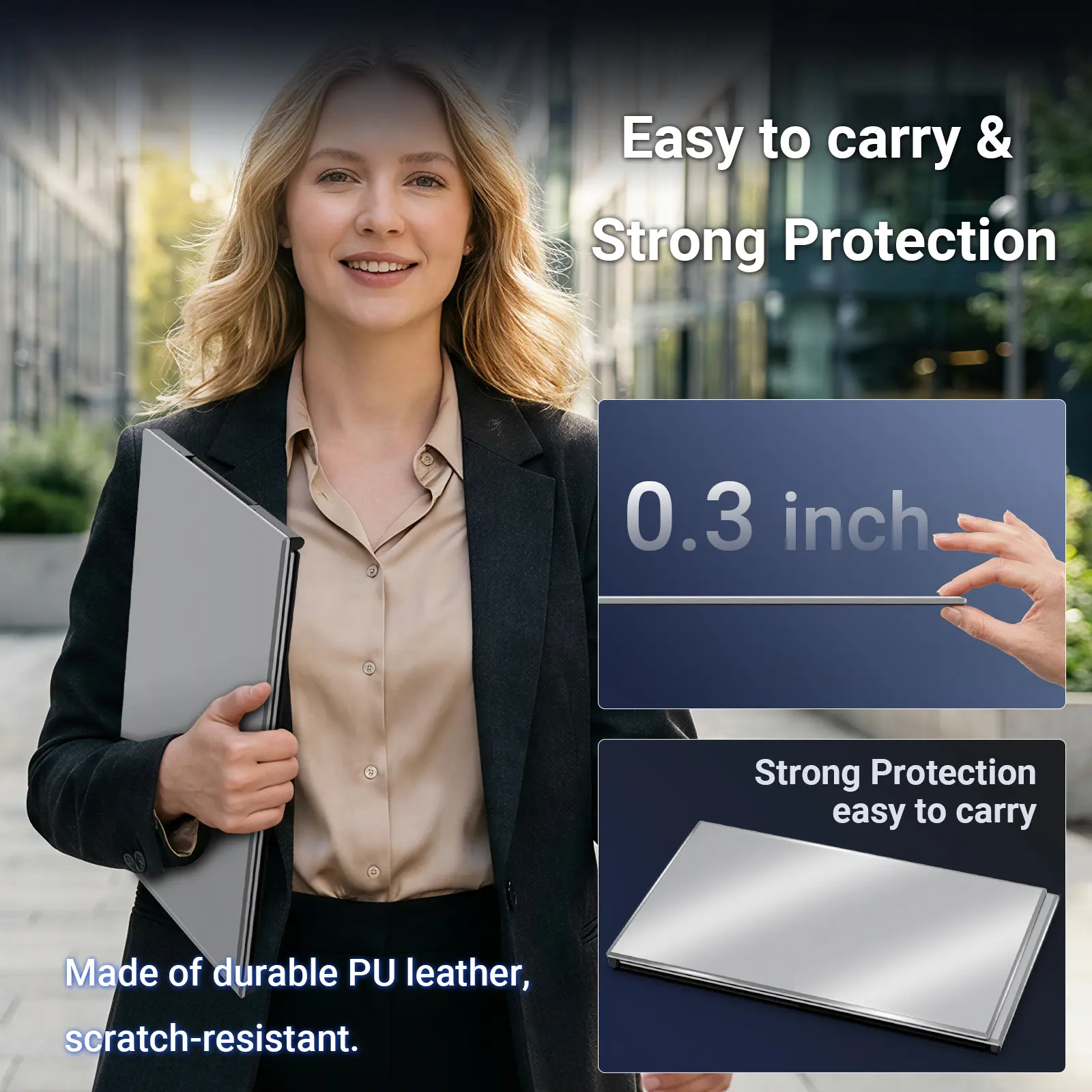 ·【Ultra-Slim Aluminum Shell, Stylish Durable Portable】The laptop screen extender monitor portable features a high-grade aluminum alloy shell that combines lightweight durability with sleek aesthetics. Incredibly lightweight at just 4 lbs (1.8 kg), its ultra-slim profile and included leather carry bag enhance convenience, making it perfect for on-the-go productivity. No top Baffle or clip, easy to remove and install. Designed to reduce stress on your laptop’s hinge.