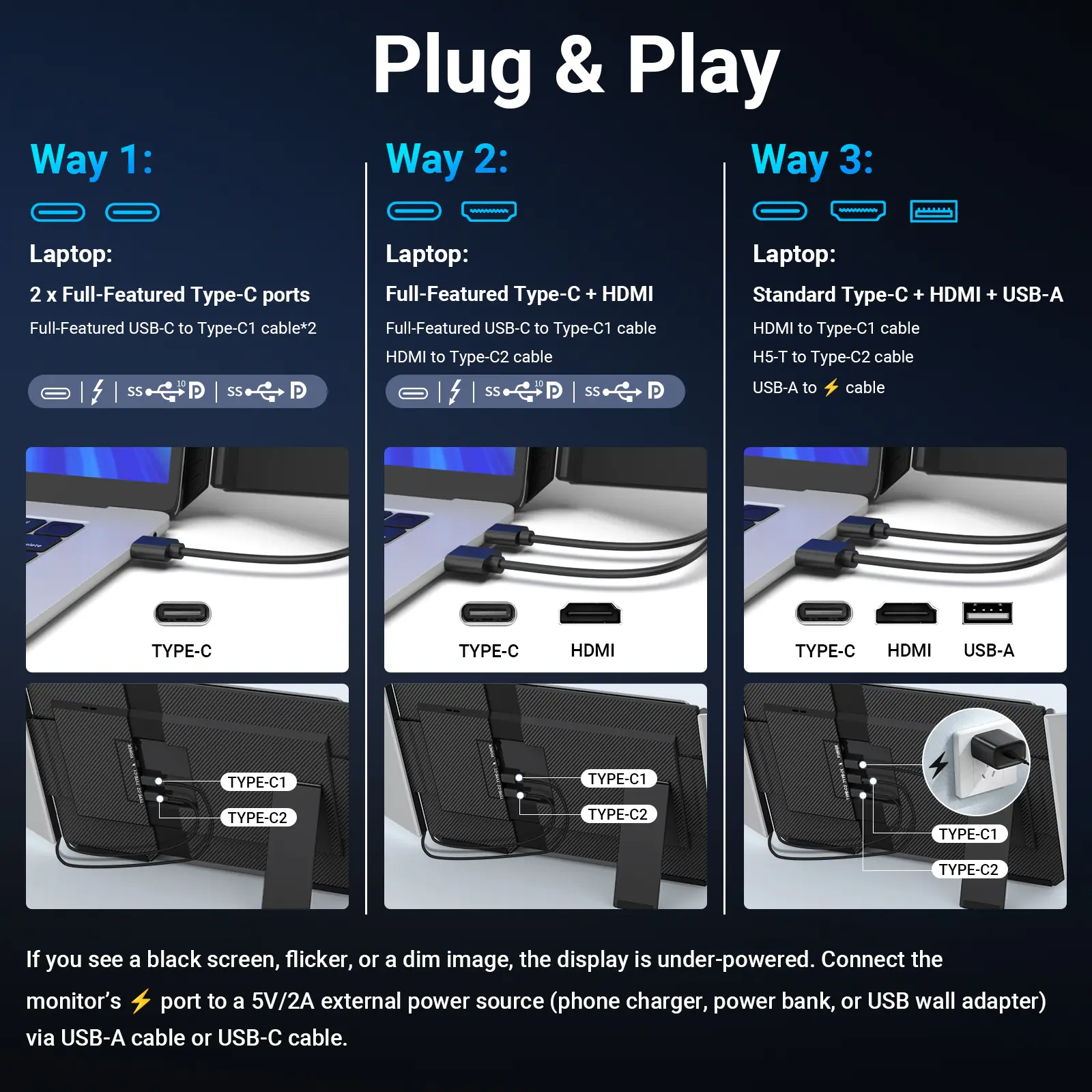 ·【Fewer Cables, Simplify Connections】Our laptop screen extender uses upgraded internals, minimizes cables and simplifies the connection process, making setup easier. Unlike traditional extenders with messy cables and compatibility issues, you only need 2 USB-C to USB-C cables (when your device supports full functionality) to connect effortlessly to your laptop. Say goodbye to compatibility worries, messy wires and complex setups, enjoy a clean desk, save space, quick setup of a dual-screen.