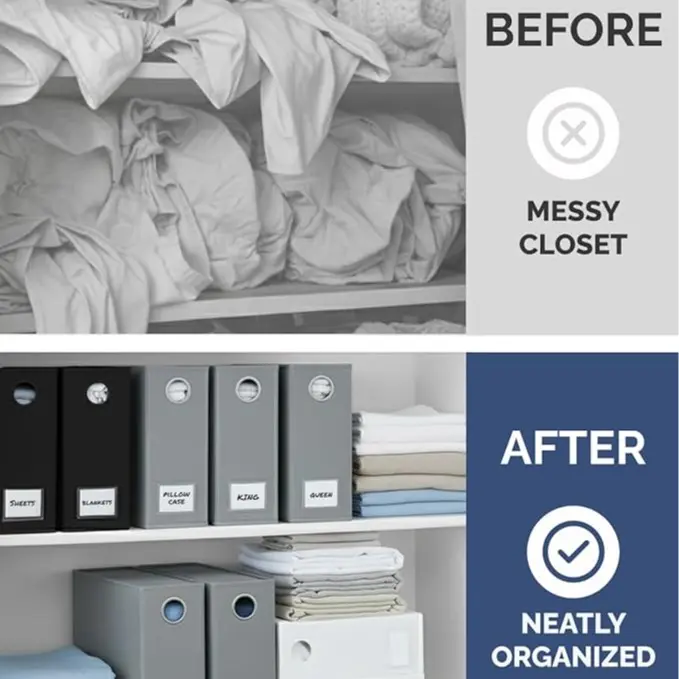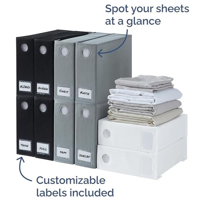 ·WINDOW & LABEL CARDS FOR QUICK ID: The front circle window and included removable label cards work together as a visual closet sheet organizer, so you can instantly spot colors, fabrics and sizes and mark sets like “King Cotton,” “Guest Room” or “Kids’ Sheets” without opening every box.