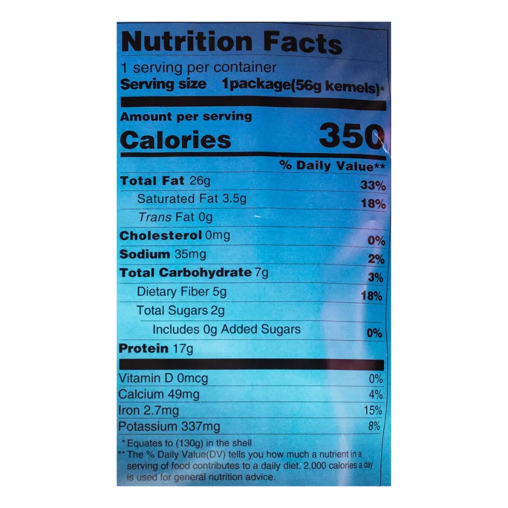 Amount per serving: Calories 350, Total Fat 26g (33% DV), Saturated Fat 3.5g (18% DV), Trans Fat 0g, Cholesterol Omg (0% DV), Sodium 35mg (2% DV), Total Carbohydrate 7g (3% DV), Dietary Fiber 5g (18% DV), Total Sugars 2g, Protein 17g, Vitamin D 0mcg (0% DV), Calcium 49mg (4% DV), Iron 2.7mg (15% DV), Potassium 337mg (8% DV).