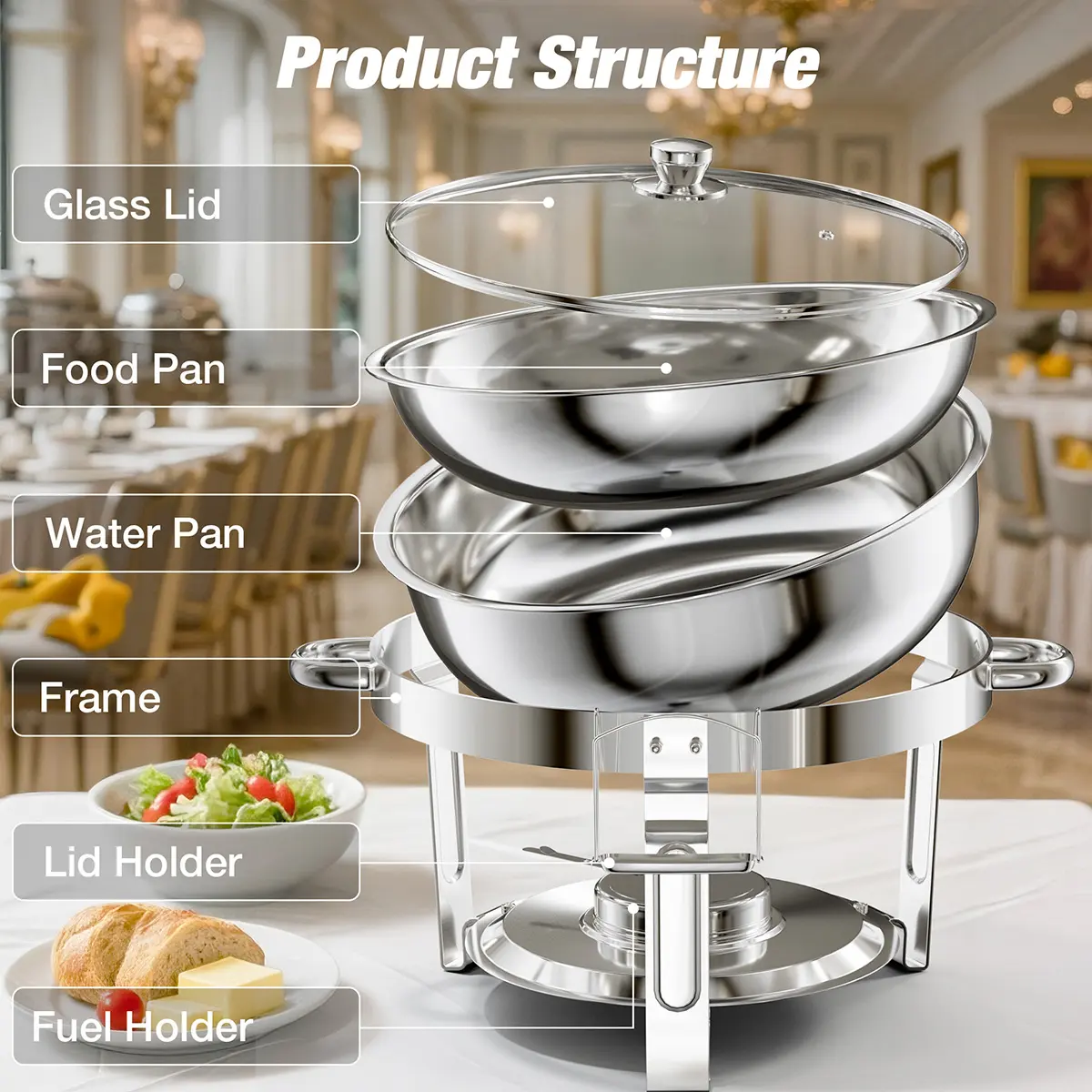What's Included (per dish): Frame, Food Pan (5QT), Water Pan, Glass Lid, Lid Holder, Fuel Holder