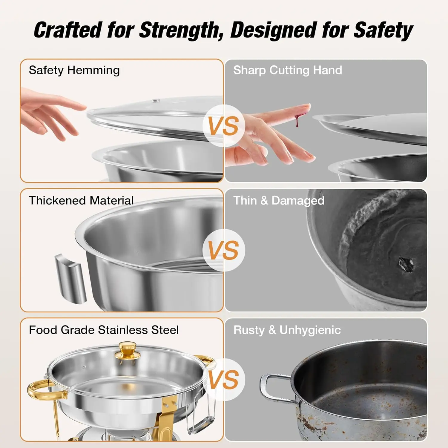 BUILT TO LAST WITH SAFE HANDLING – Made from heavy-duty, food-grade stainless steel, these luxury buffet chafing dishes resist rust, dents, and wear for long-term use. Smooth rolled rims provide safe handling, preventing accidental cuts during setup and service