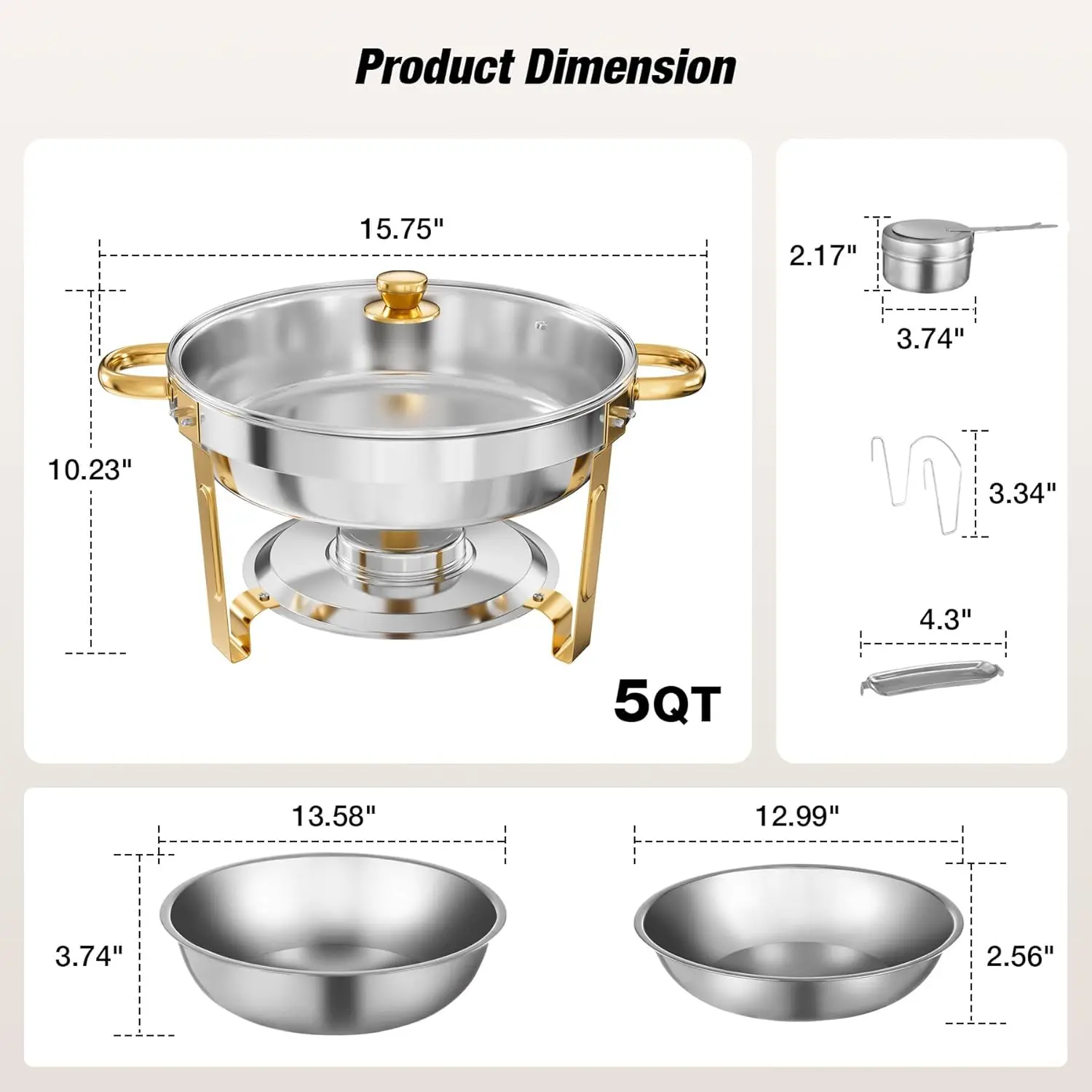 What's Included (per dish): Frame, Food Pan (5QT), Water Pan, Glass Lid, Lid Holder, Fuel Holder