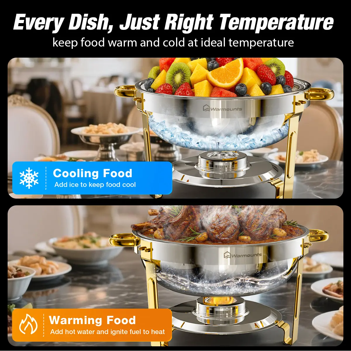 STACKABLE DESIGN SAVES SPACE – Stack neatly to maximize storage in kitchens or catering areas. Keep gold chafers and buffet warmers sets organized, accessible, and ready for any event without clutter