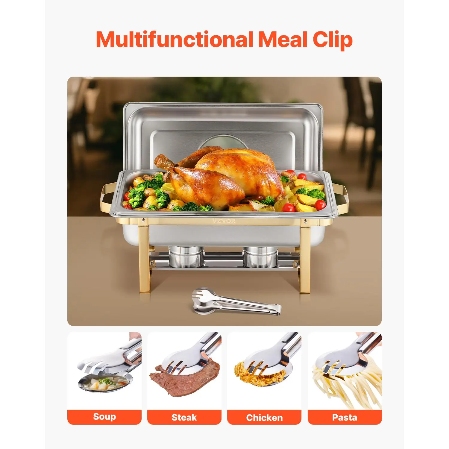 • Ample 8QT Capacity: With a large capacity, this catering chafer can hold multiple servings of your favorite dishes. The included multifunctional meal clip makes it easy to serve pasta, steak, soup, chicken, and more