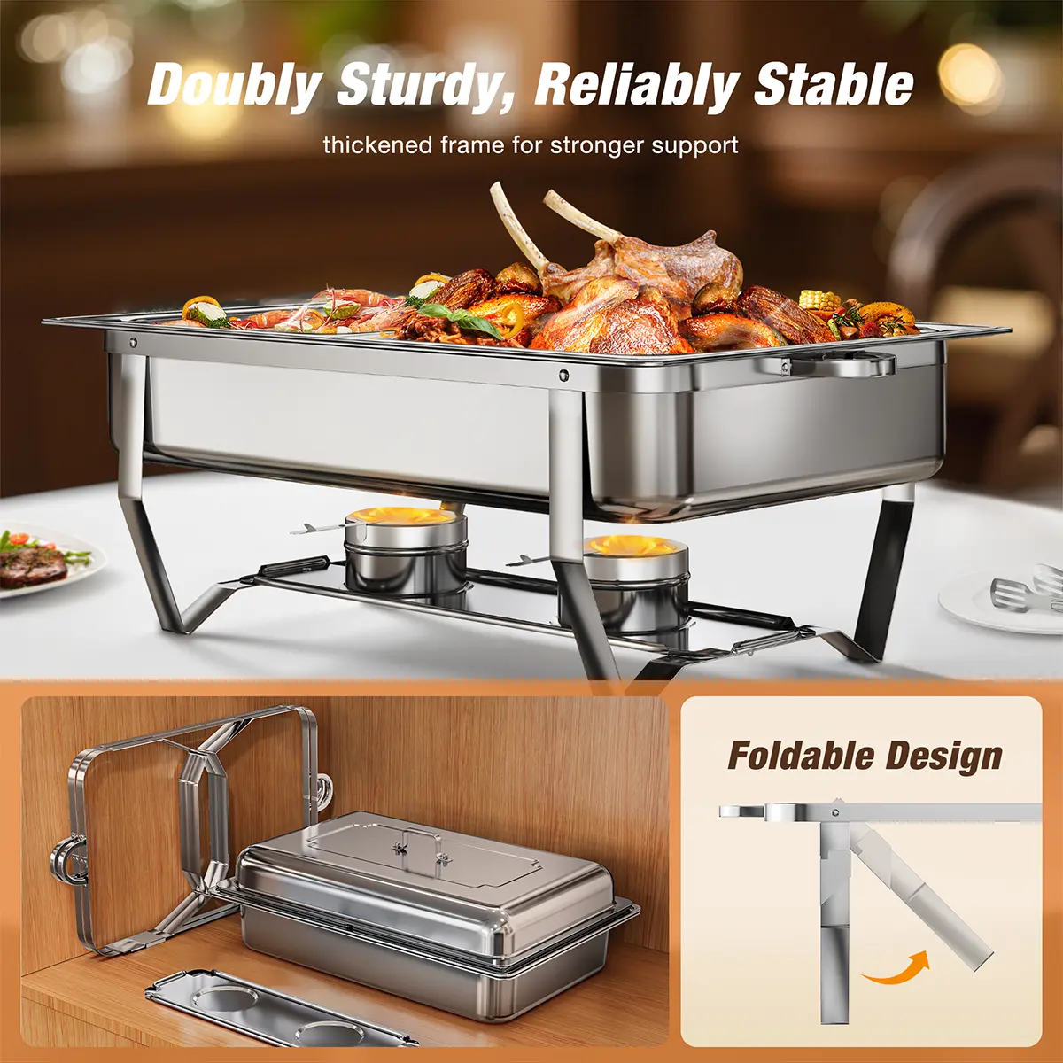 FOLDABLE & STURDY FRAME FOR STABILITY - Built with a thickened, foldable frame, these rectangular chafing dishes for buffet offer enhanced support and stability for heavier food loads. The foldable design makes storage and transport easier for mobile indoor and outdoor catering, parties, and tight kitchen spaces