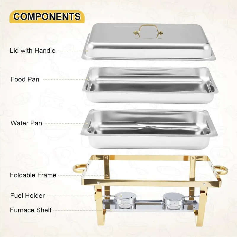 Complete Set for Every Occasion: Each chafing dish includes a foldable frame, full size food pan, water pan, lid with handle, fuel holder, and fuel holder tray. This buffet chafer set ensures that your food will be elegantly presented to your guests, allowing them to enjoy a delightful dining experience.