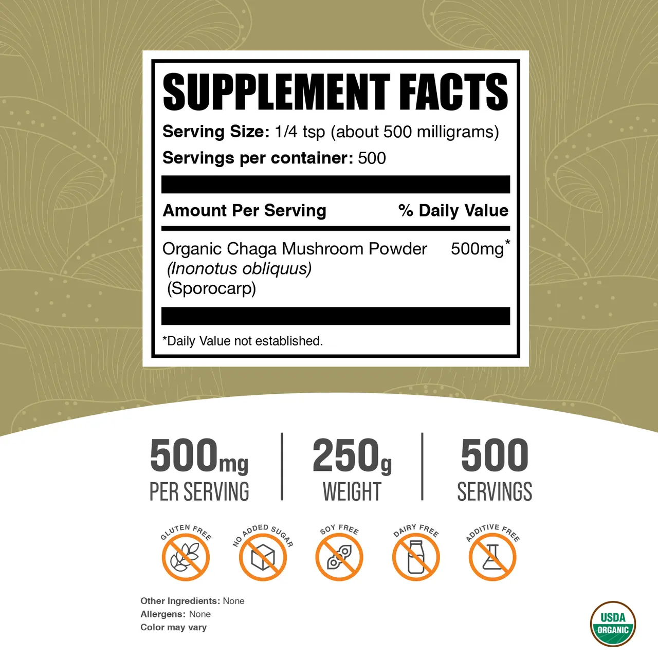 Liver support: Chaga mushroom powder may help support liver health and detoxification processes by protecting the liver from damage and promoting its function.