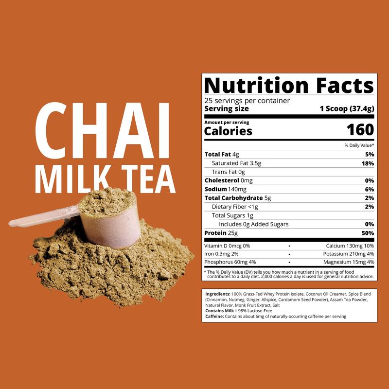 Want an iced chai for just 2 dollars a serving and 25 g protein? Look no further. I'm a huge fan of boba tea protein--I love the 5 flavors I own. I will say this is my least favorite out of all of them (which again, is saying something because I still like it) because its a little gritty and lacks a strong black tea/chai taste (very little caffeine), but is sweet with a complex spice profile. Boba tea protein has got my money for life--I'll continue to be their cusotmer but I would like if they added caffeine/more chai flavoring.