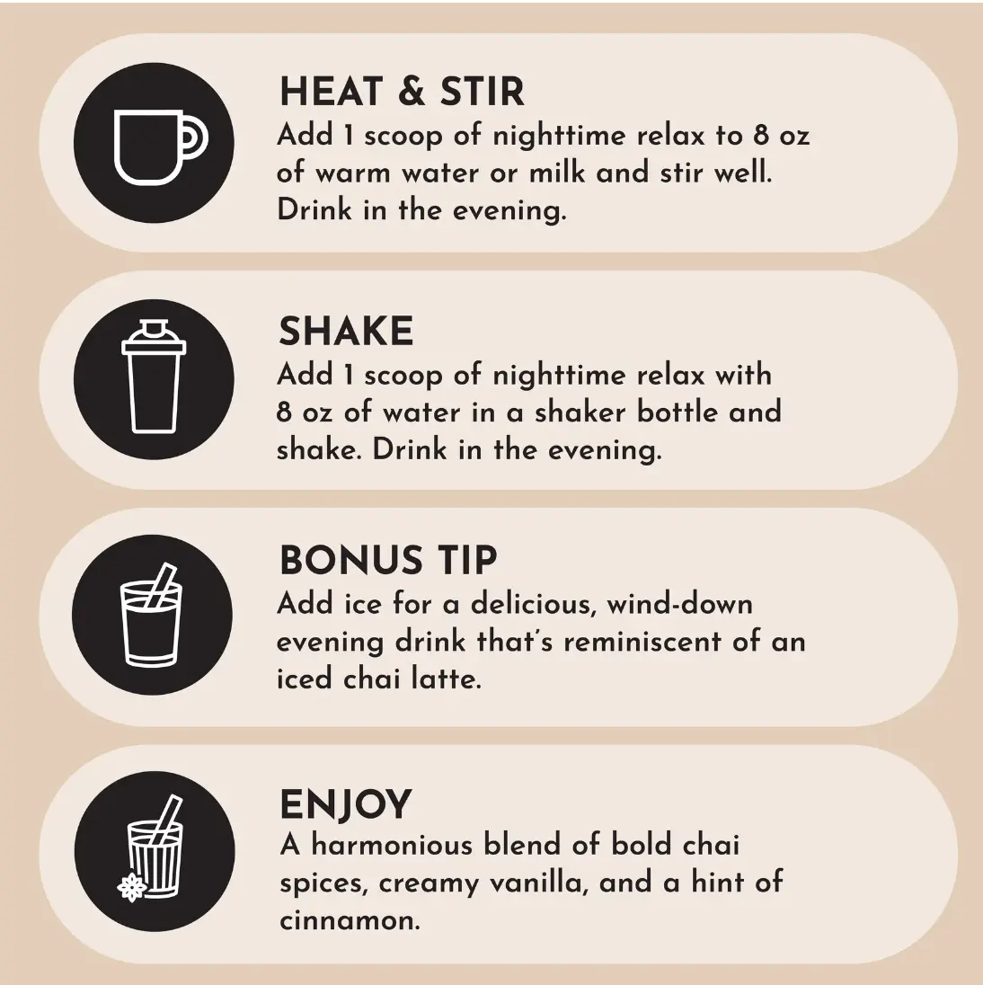 • Add 1 scoop of nighttime relax with 8 oz. of water into a cup and stir.