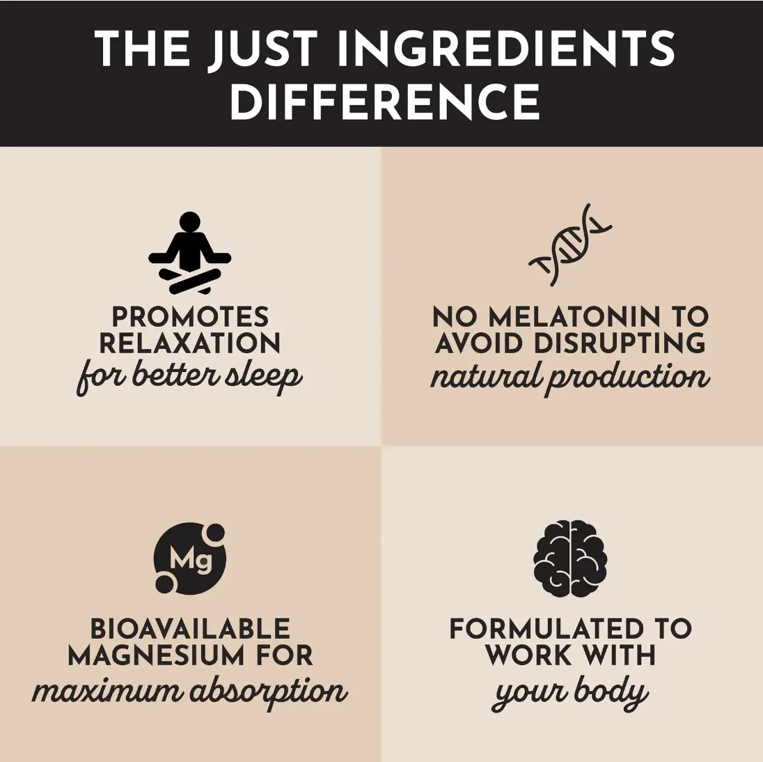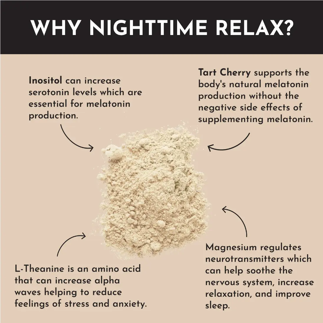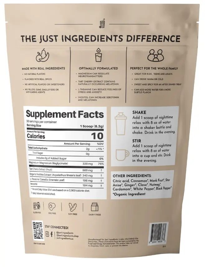 Magnesium (Magnesium Bisglycinate), Tart Cherry Extract (Fruit), Rooibos Extract* (Aspalathus linearis leaf), L-Theanine (Camellia Sinensis Leaf), Inositol