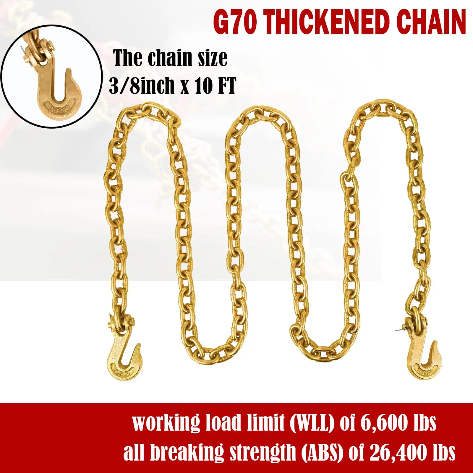 Each G70 chain supports a working load limit up to 6,600 lbs and a breaking strength up to 26,400 lbs. Select variants support up to 9,200 lbs WLL. The binder and chain are engineered with strict safety ratios (Binder 3:1, Chain 4:1) for reliable heavy-duty hauling. The ratcheting binders enable accurate tension adjustment and secure fastening.
