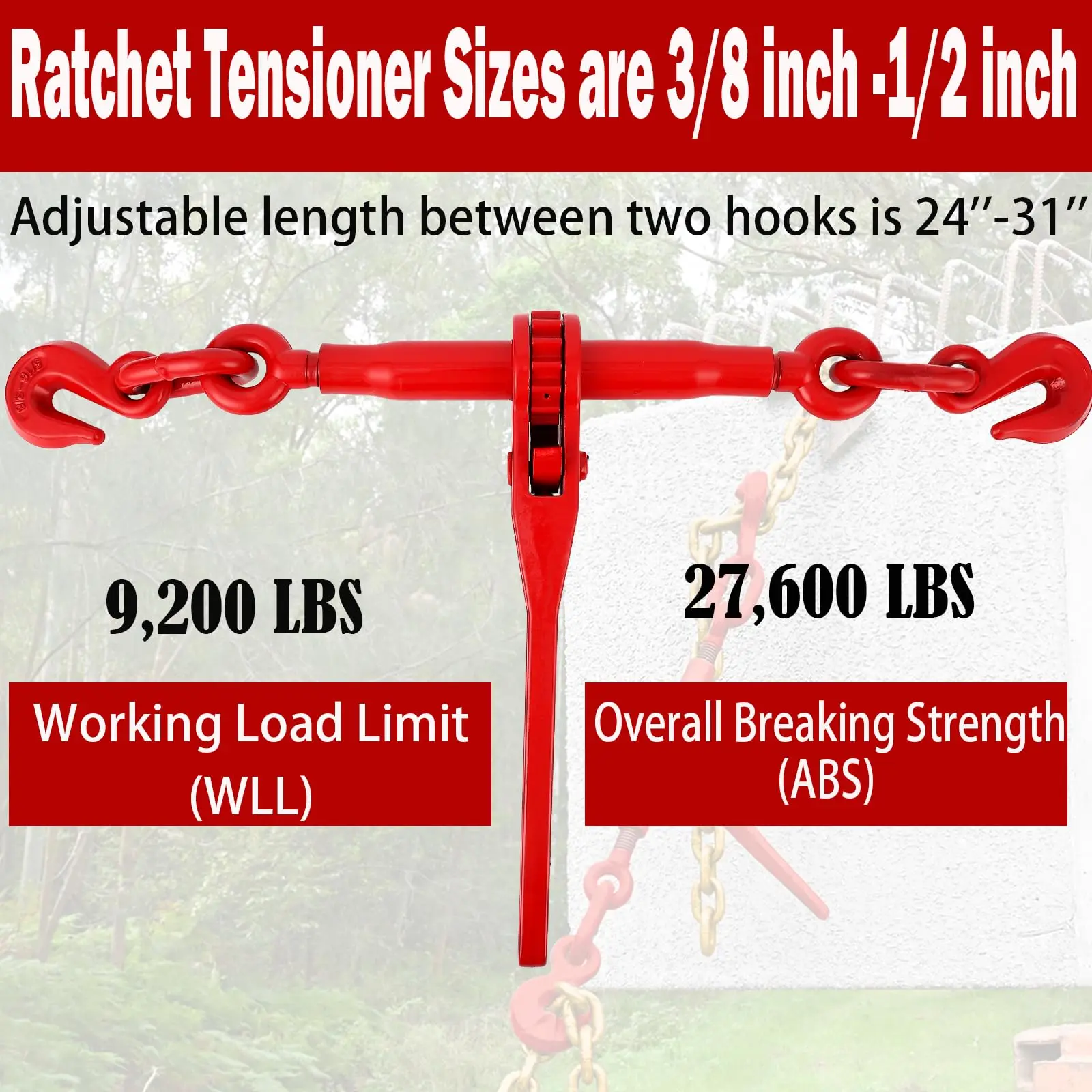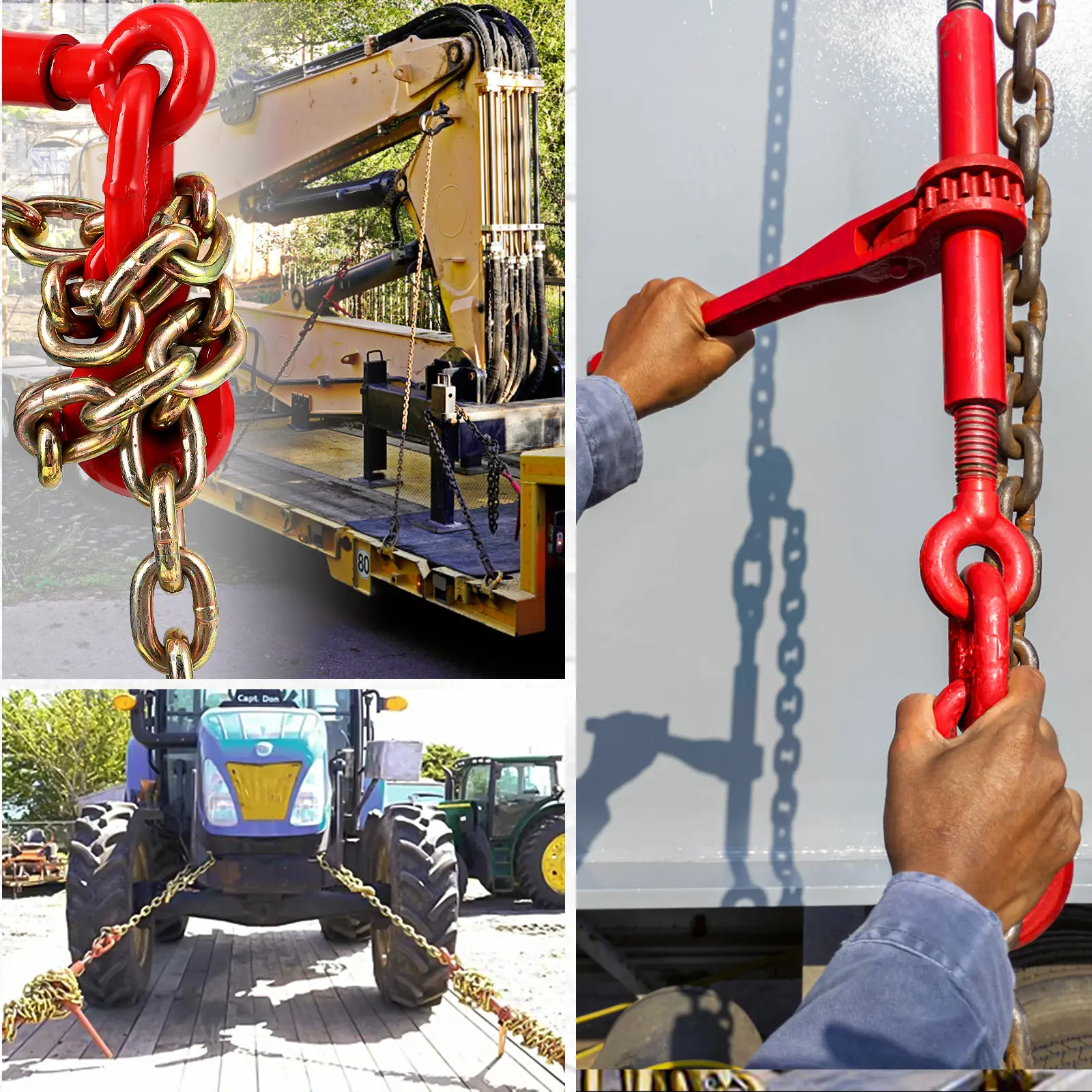 The adjustable hook range and 14" leverage handle ensure easy operation and versatility. Each set comes fully equipped with chains, ratchet binders, and steel U-shaped grab hooks, providing everything needed for quick, efficient cargo management. Perfect for truck drivers, farmers, towing professionals, and anyone needing reliable load security.
