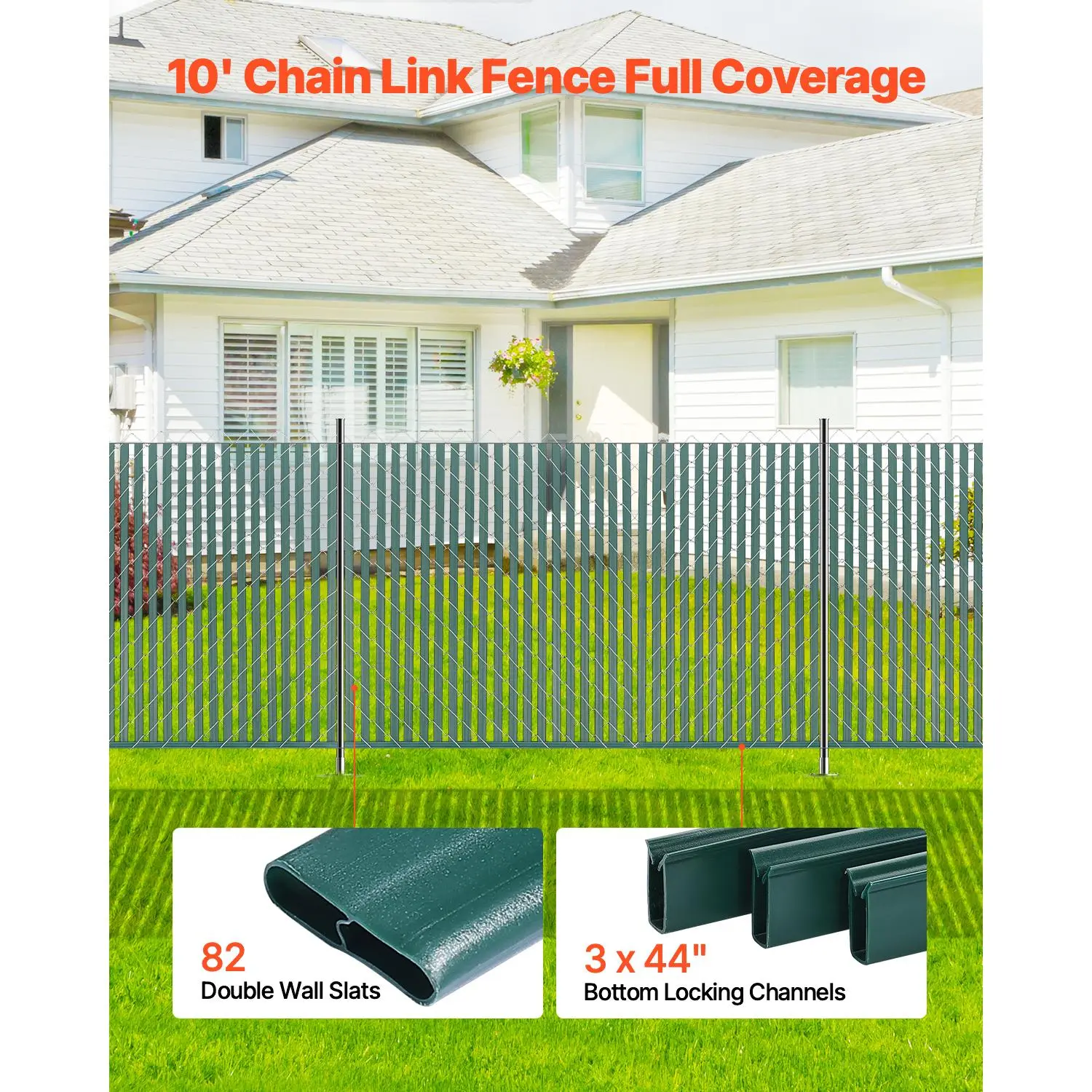 • 10' Chain Link Fence Full Coverage: Each box includes 82 double-wall chain link fence slats and 3 pieces of 44" bottom locking channels, specially designed for 10 ft chain link fences.