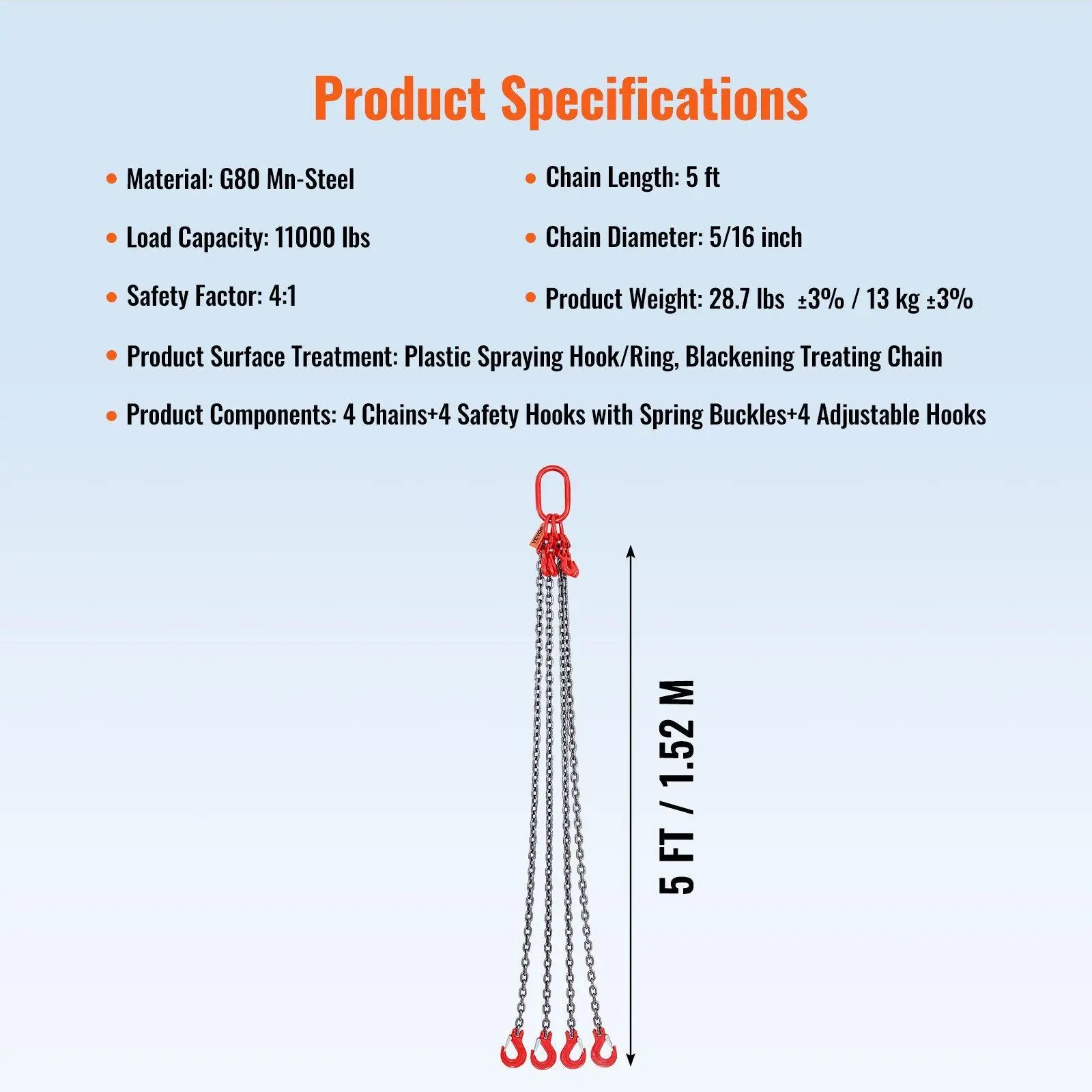 ·11000 lbs Load Capacity: Our tow chain has a load limit of 11000 lbs and 4:1 security factor. Diameter: 5/16 inch; Chain Length: 5 ft. Thanks to these features, you can use it with no worries.