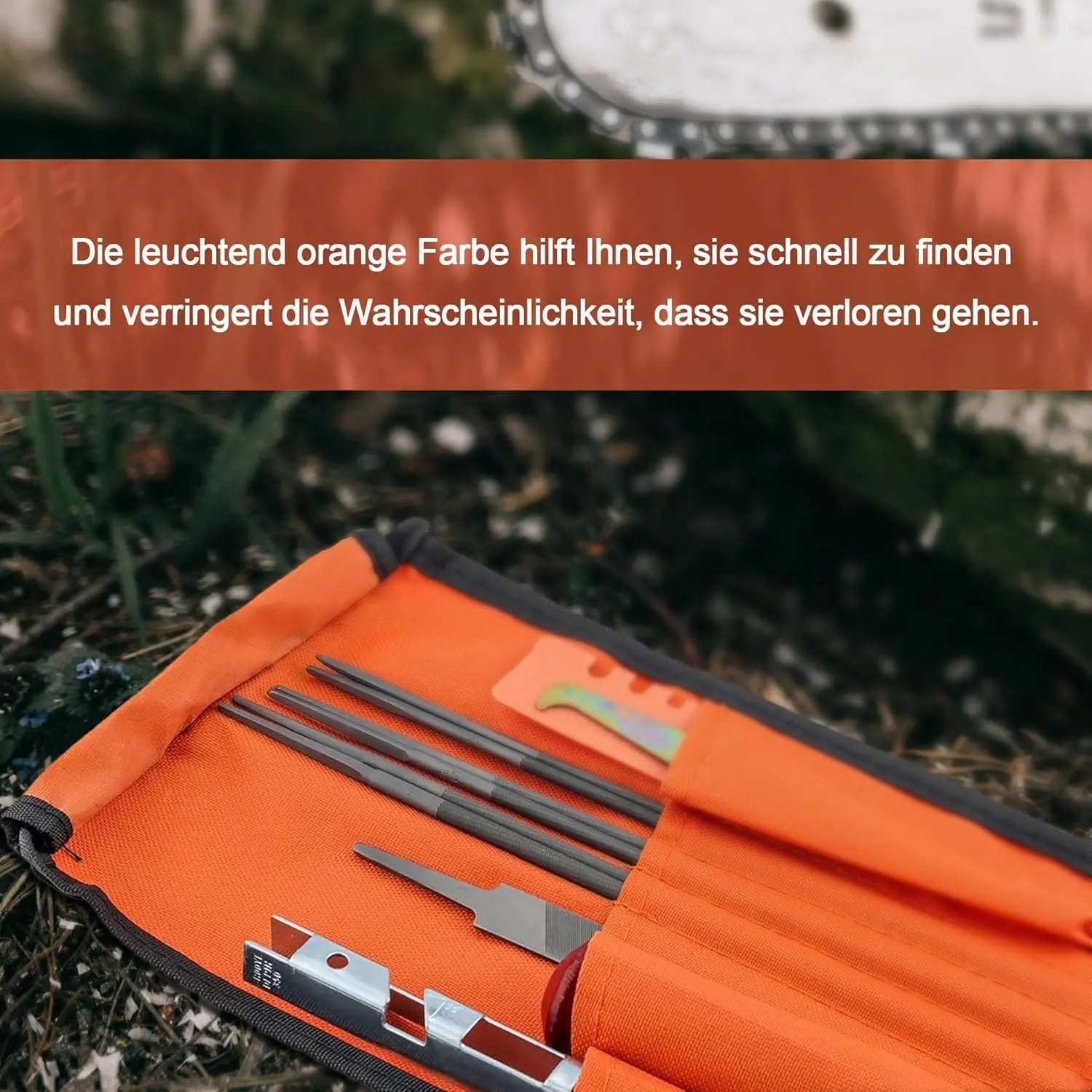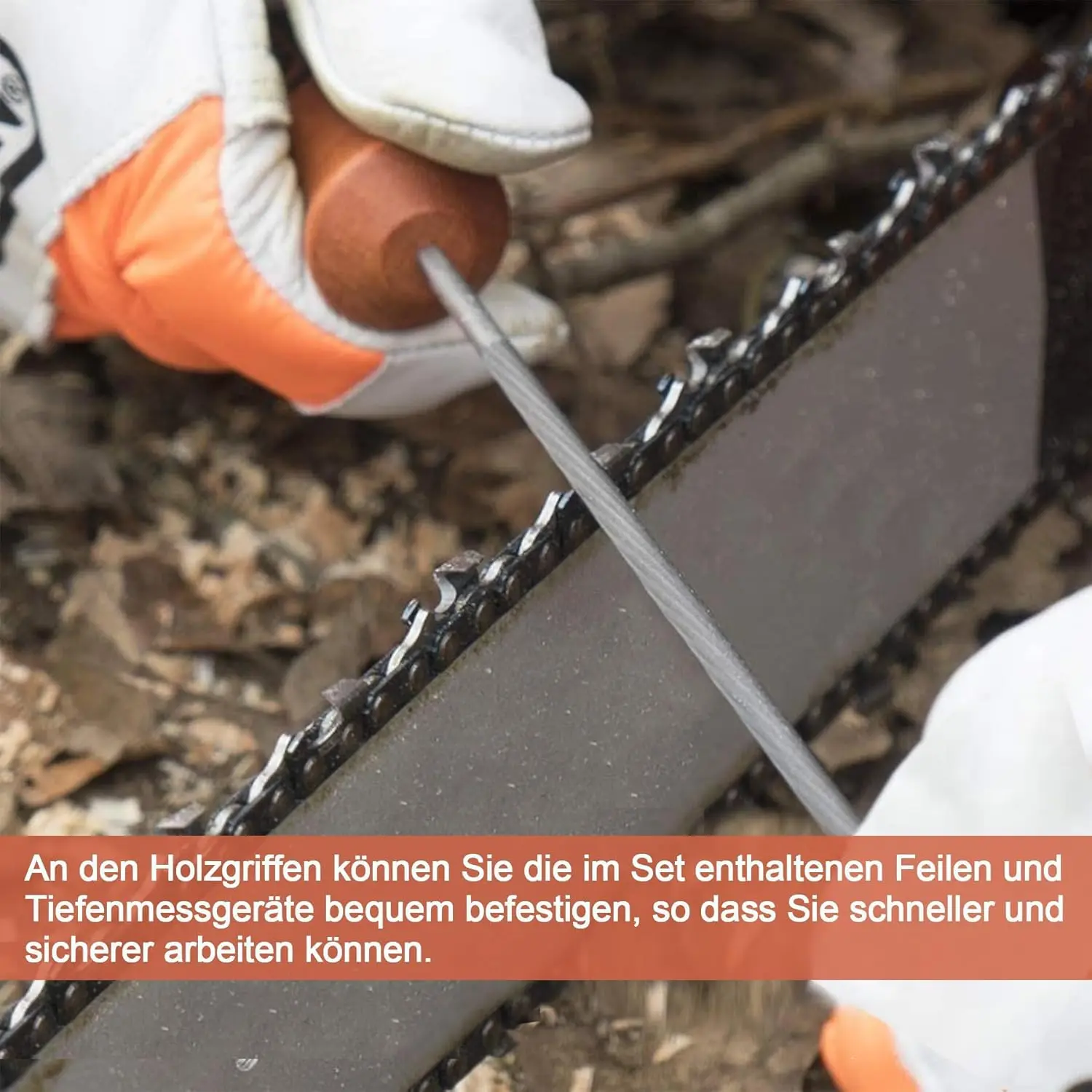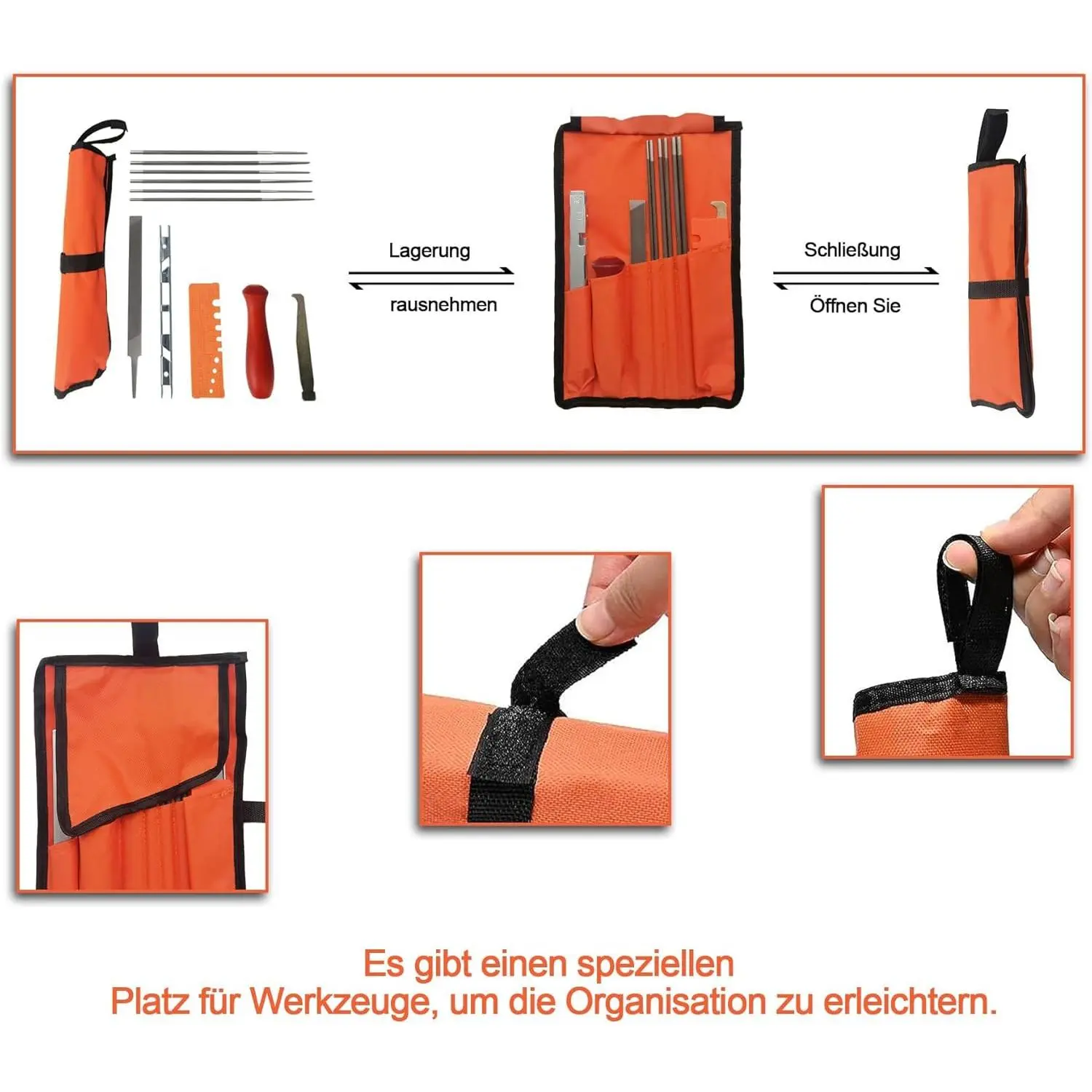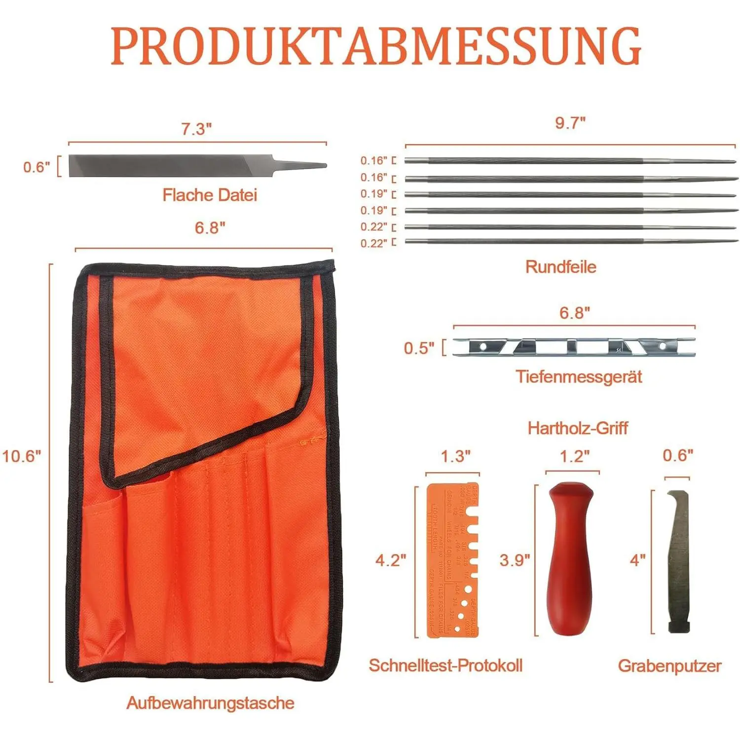 12 Kit includes 6 round files 5/32(4.0 mm)*2,3/16(4.8 mm)*2,7/32(5.5 mm)*2 and 6 inch flat file, depth gauge, bar slot cleaner, quick check gauge, hardwood handle with protective coating, portable storage bag.