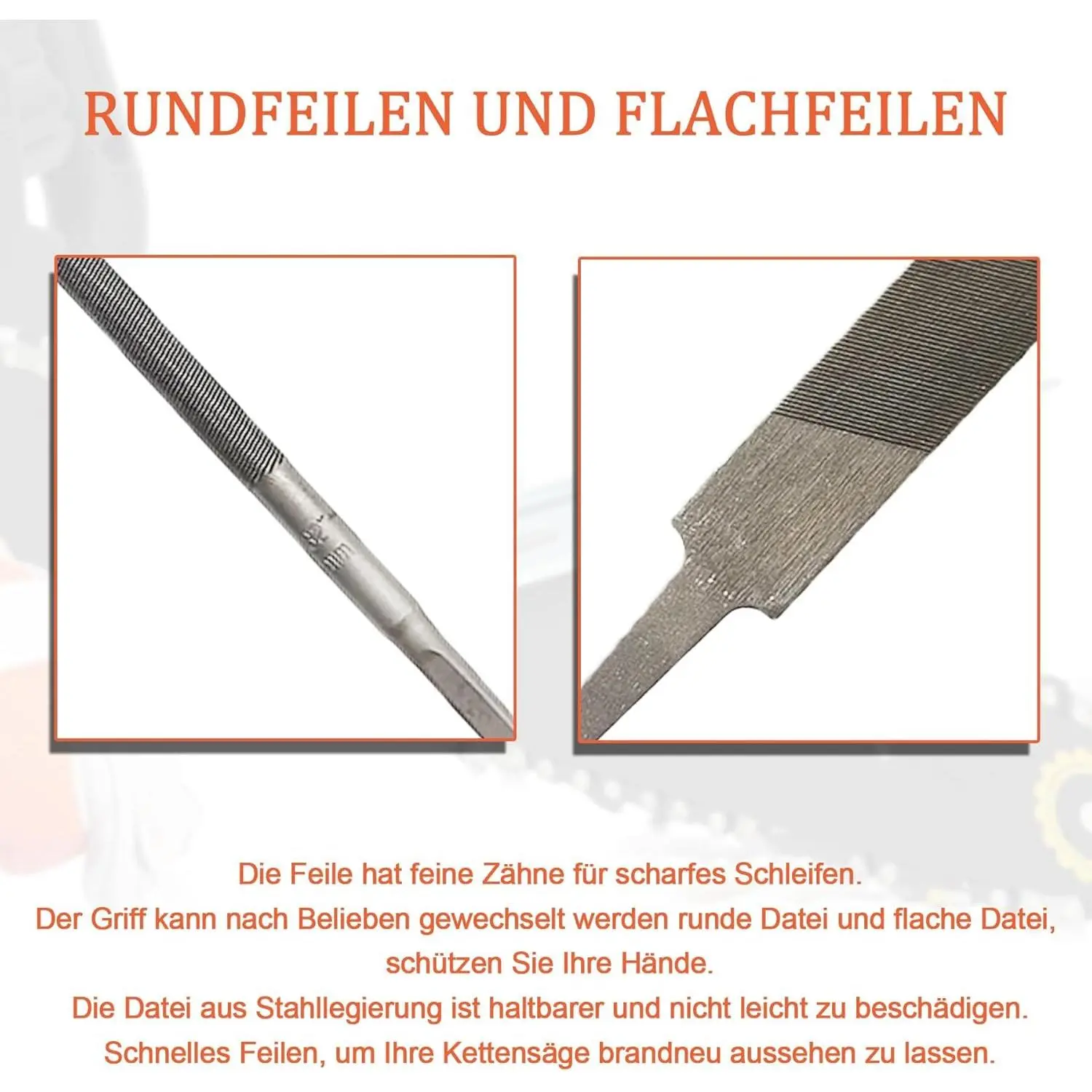 There is a range of different files inside to suit any of your chainsaw sharpening needs.