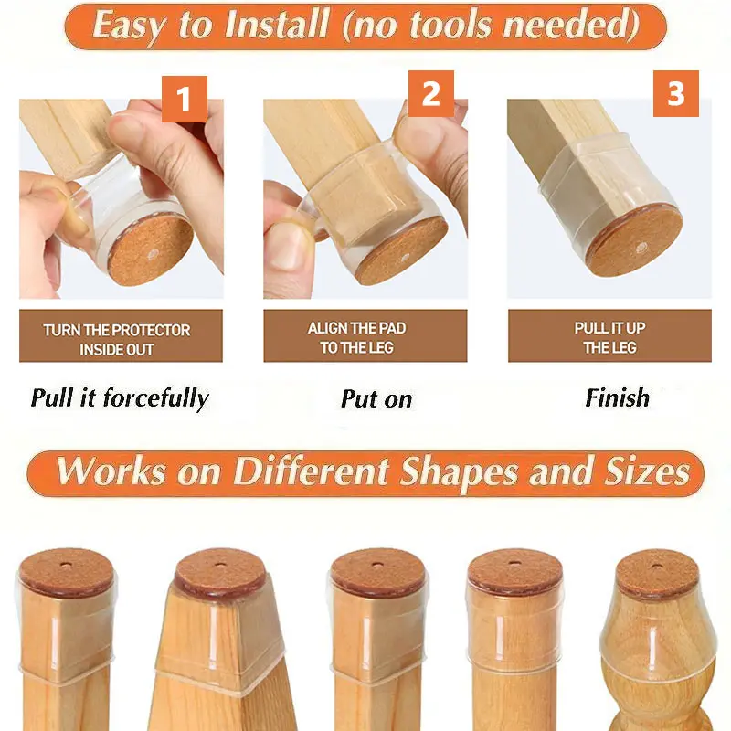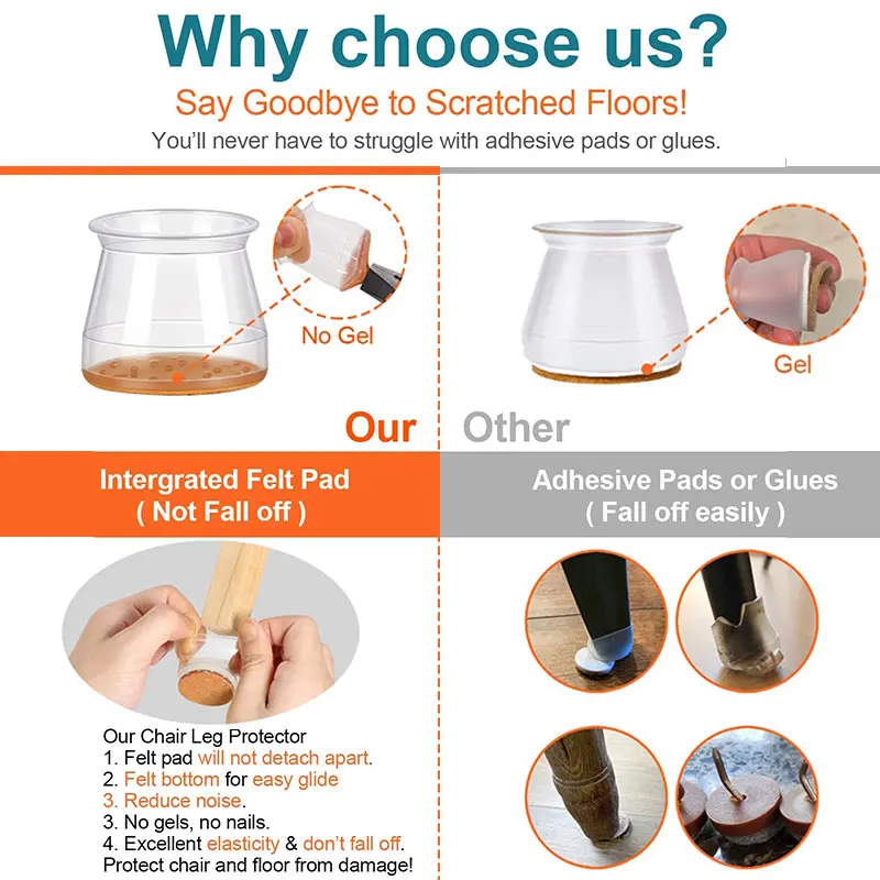 Protect your floors with our chair leg rubber caps!Perfect for square legs, they fit securely on wood, tile, or parquet to stop scratches. The built-in felt pad prevents slipping and noise, making chairs glide smoothly and quietly.